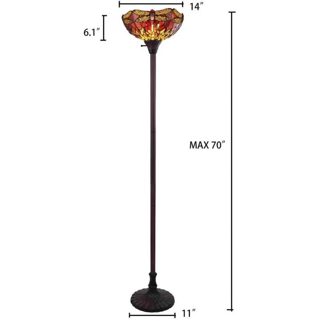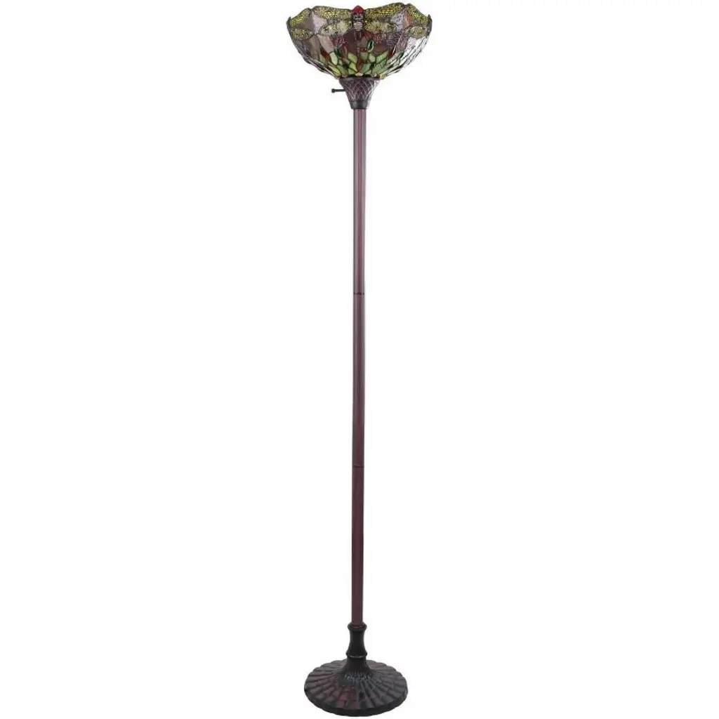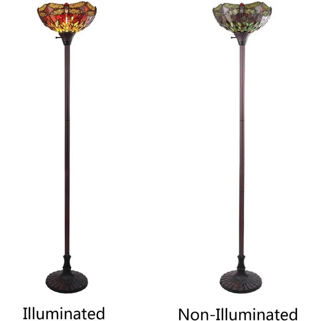 Empress is a beautiful dragonfly-style torchiere floor lamp, featuring stained glass that will cast a warm glow for your home. It is made up of 220 pieces of copper-foiled, stained art glass, 45 glass beads and 20 crystals, expertly designed and crafted by hand. Each of CHLOE`s Tiffany-style stained glass products are formed using the very same techninique developed by Louis Comfort Tiffany in the early 1900`s, using hand cut stained art glass, each wrapped in fine copper foil and soldered together at extremely high temperatures to form each unique piece. Exact size to the nearest inch may vary, and exact color of each glass piece may vary due to each piece being hand crafted. First image is with the light shining through, second image is with no light. Dry listed and recommended for an indoor setting.
