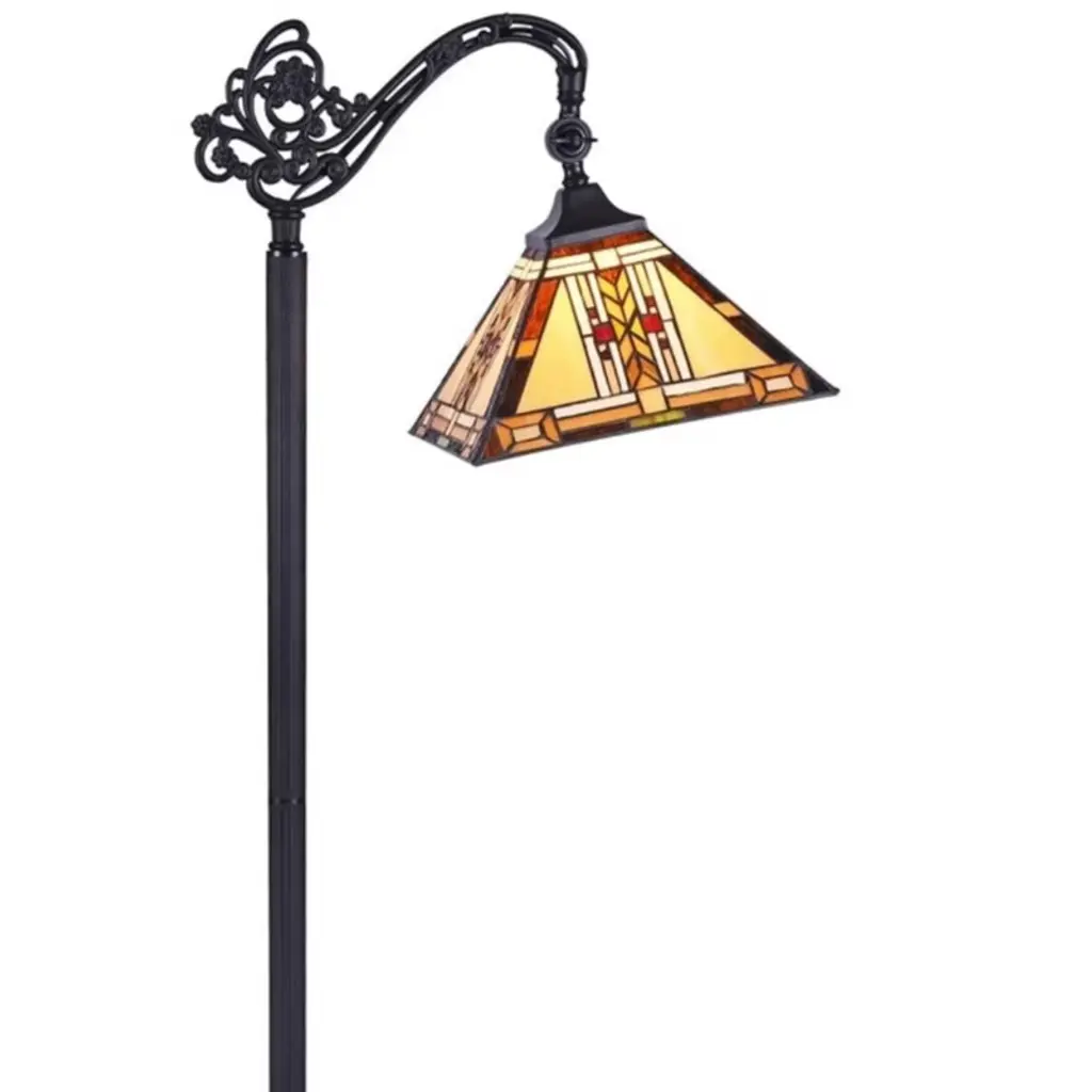 Bring vintage character and practical illumination to your reading nook or cozy corner with the Gode Tiffany-style floor lamp. Showcasing a handcrafted Mission-style shade with multicolored antique tones and a unique ring of cut glass circles, this elegant floor lamp delivers both form and function. The antique bronze finish and foot-step switch make it a stylish and convenient choice for daily use. Key Features: Mission-style stained glass shade with rich antique-toned paletteHandcrafted with 276 precisely cut glass pieces for artisanal charmSingle E26 socket supports 100W max Type A bulb (not included)Durable resin and iron base with 87" cord and on-cord foot switchDimensions: 61.4"H x 11.2"W x 11.2"D | Shade: 11.2"W x 5.51"H |Weight: 13.89 lbs A functional accent piece that brings classic elegance to any indoor space.