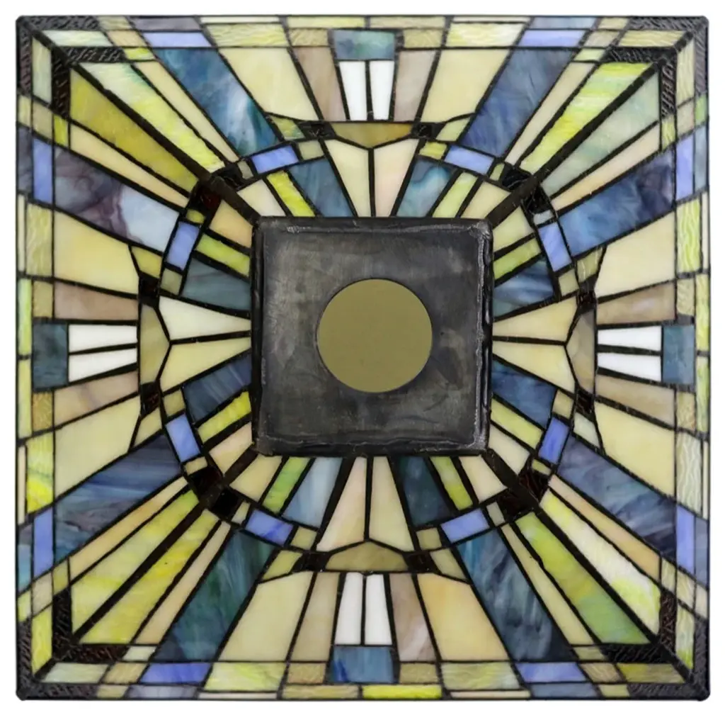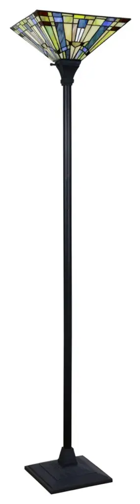 Kinsey is a beautiful, stained glass torchiere floor lamp in a traditional Mission style, featuring a blackish bronze base and rotary switch. This lamp would be perfect in a bedroom, living room, and dining room. The shade is hand-crafted, using the same methods developed by Louis Comfort Tiffany in the early 1900''s. This process entails using 232 hand cut stained art glass pieces, each wrapped in fine copper foil and soldered together at extremely high temperatures to form each unique piece. Exact size to the nearest inch may vary, and exact color of each glass piece may vary due to each piece being hand crafted. First image is with the light shining through, second image is with no light. Dry listed and recommended for an indoor setting.