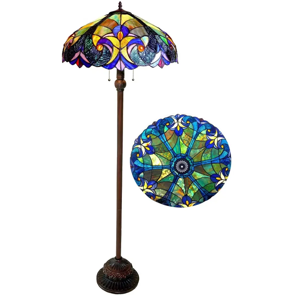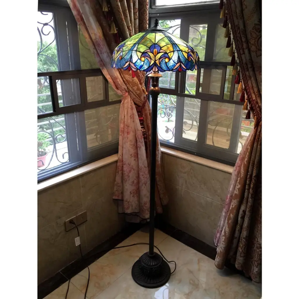Infuse your space with classic elegance and soft color using the Liaison Victorian Floor Lamp. Handcrafted from 306 pieces of genuine stained Tiffany-style glass and 18 jewel-like beads, the mosaic pattern in pastel tones glows with vintage charm. The rich, dark antique bronze resin base supports an 18-inch round shade, offering ambient downlight for any indoor setting. A timeless addition to traditional or transitional interiors. Key Features: Requires (2) 100W max E26 Type A bulbs (not included) for warm, ambient illumination Classic pull-chain switches and antique bronze finish for period-authentic flair Tiffany-style shade handcrafted from 306 stained glass cuts and 18 decorative beads Designed for indoor use with durable resin base and 84" corded power plug Dimensions: 18" W x 62" H | Shade height: 8.25" | Base width: 10.75" | Weight: 15.4 lbs