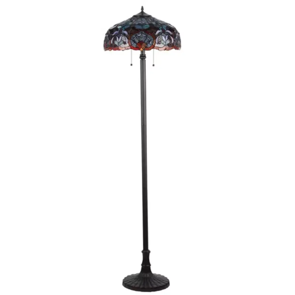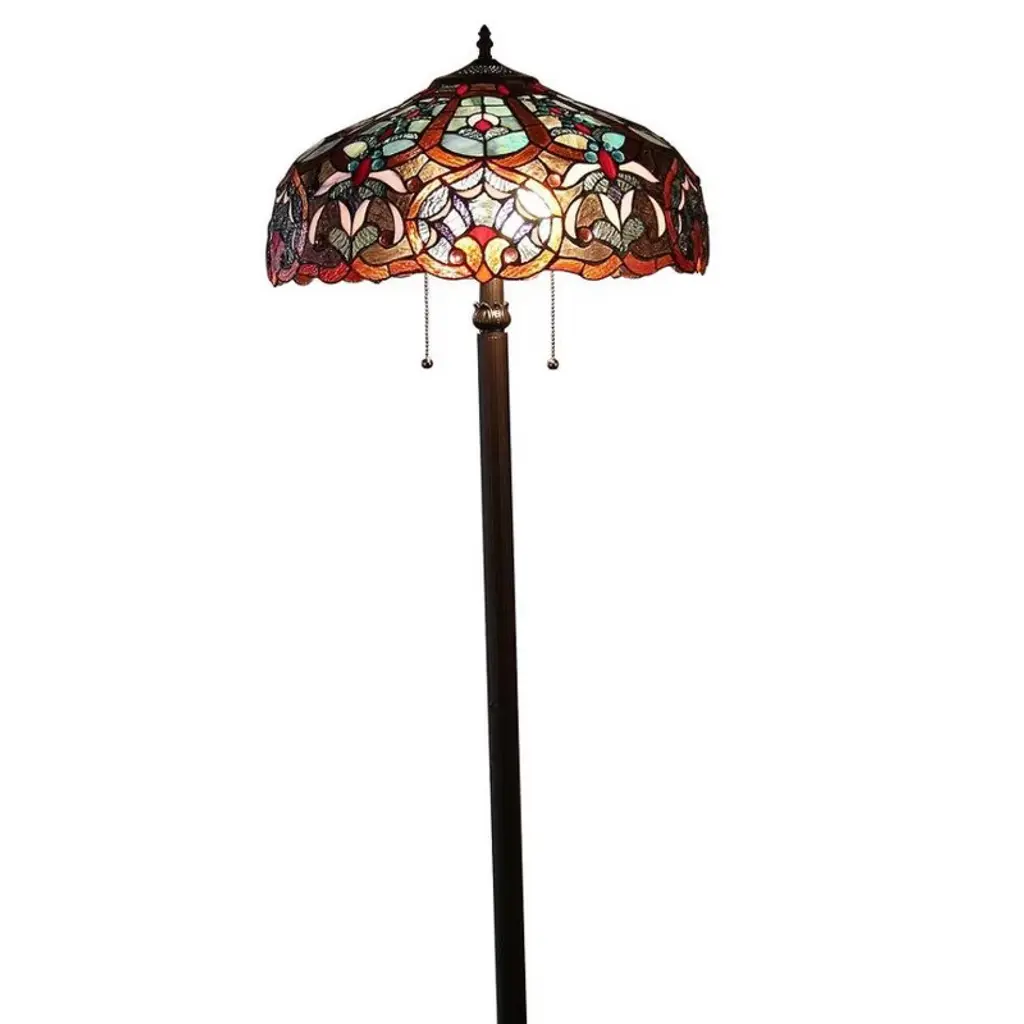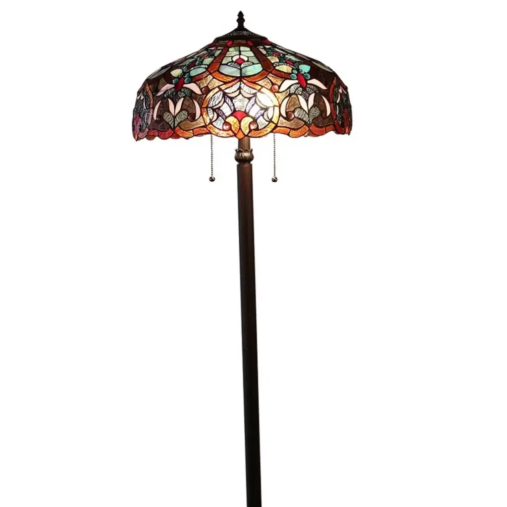 Elevate your living space with the Chloe Lighting SADIE Tiffany-Style 2-Light Victorian Floor Lamp, featuring a generously sized 18-inch stained glass shade. This elegant lamp showcases a Victorian floral motif in vibrant jewel tones—red, amber, green, and cream—handcrafted using the traditional copper foil technique. Each shade is a unique work of art, composed of hand-cut glass pieces that diffuse warm ambient light throughout your room. The antique bronze-finished base adds timeless sophistication, making it ideal for living rooms, reading corners, or study areas where style and functionality meet. Key Benefits Victorian Elegance: Floral stained glass shade creates a luxurious focal point Generous 18" Shade: Provides broad, ambient lighting for living rooms or reading nooks Dual-Light Functionality: Two bulbs offer layered lighting with independent control Artisan Craftsmanship: Hand-cut stained glass ensures each lamp is one-of-a-kind Timeless Design: Antique bronze base complements both classic and eclectic decor