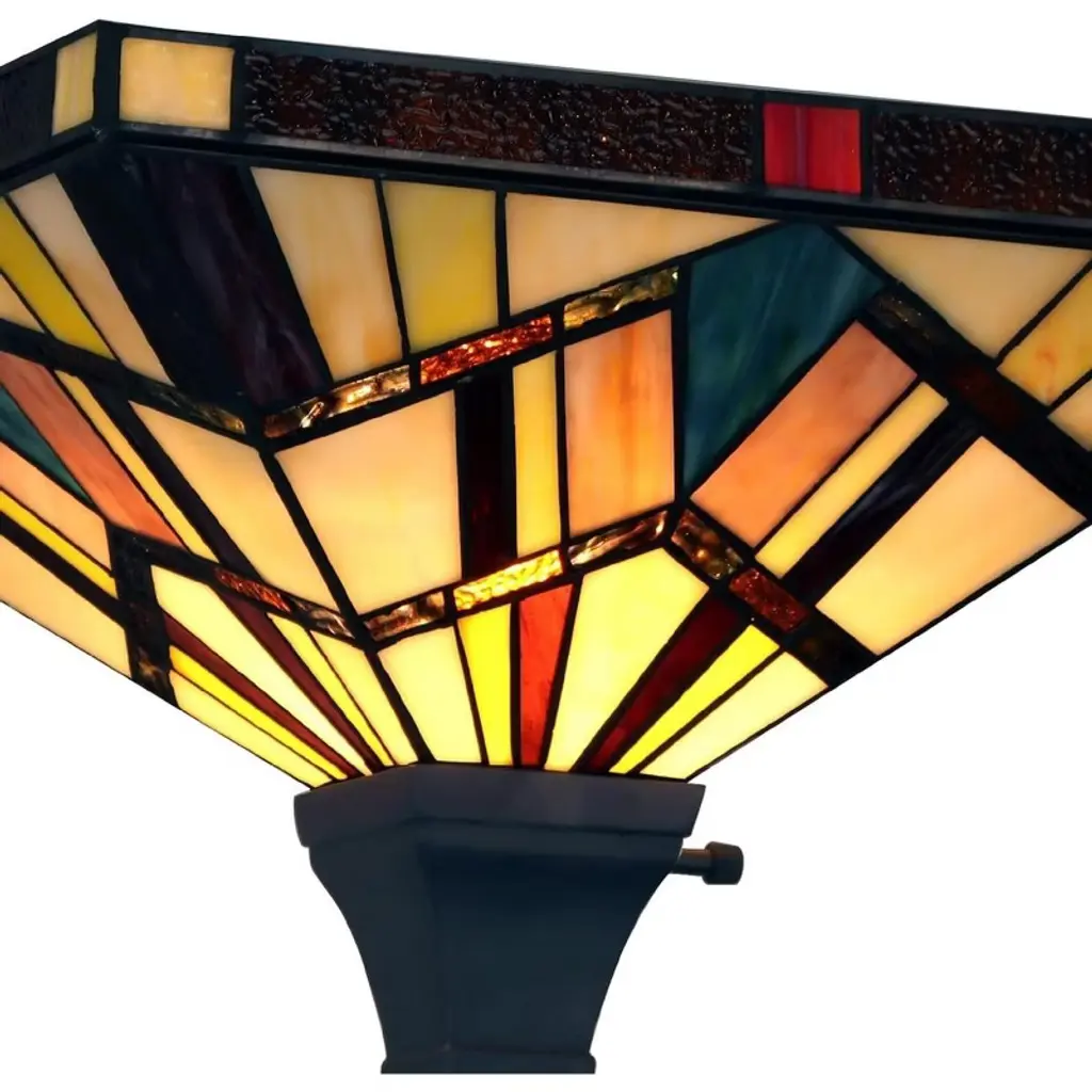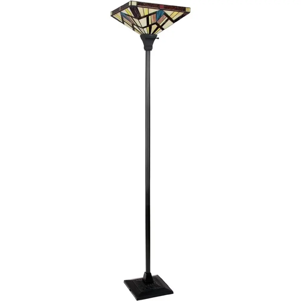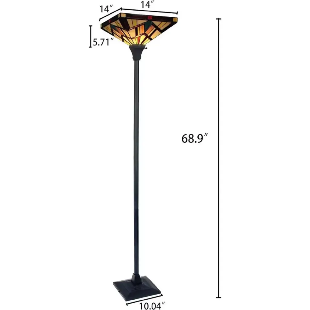 VINCENT, a Tiffany-style Mission design 1-light torchiere floor lamp features a blackish bronze finish that will complement many decors throughout your home. Hand crafted from individually hand cut pieces of art glass that will add color and beauty to any space. Main colors are beige and green. Handcrafted using the same techniques that were developed by Louis Comfort Tiffany in the early 1900s, this beautiful Tiffany-style piece contains 164 hand-cut pieces of stained glass, each wrapped in fine copper foil. This fixture is compatible with flourescent, incandescent, and LED bulbs. UL Listed, Dry listed and recommended for an indoor setting only.