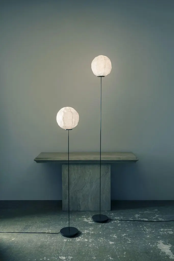 Cho lightA poetic floor lamp with a design made possible by cutting edge manufacturing techniques, Cho Light, by Swiss designer Dimitri Bähler, combines traditional Japanese Washi paper with a breathtakingly thin carbon-fibre rod. An extremely pure design, something completely new yet familiar. A unique combination of the traditional and the cutting edge. The shade is an organic crumpled form made from off-white Japanese Washi paper which is frequently used in Japanese paper lanterns of the highest quality.DimensionsF1: Ø250mm × H1400mm, cable 1500mm 4.3kgF2: Ø250mm × H1850mm, cable 1500mm 4.4kgF1: Ø500mm × H1650mm, cable 1500mm 4.3kgF2: Ø500mm × H2000mm, cable 1500mm 4.4kgMaterialsPowder-coated steel, magnetic fixings, carbon fibre (rod), lacquer, Washi paper (shade), pyrex glass diffuserColoursShade: off-whiteBase: blackTechnical detailsSupply Voltage220/240Vac, 50-60Hz110/120Vac, 60HzDimmableContinuous touch dimmable foot switch