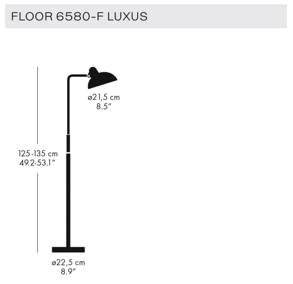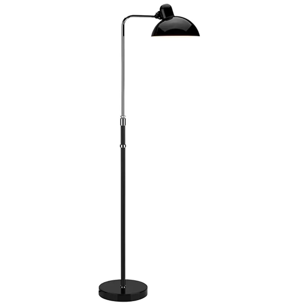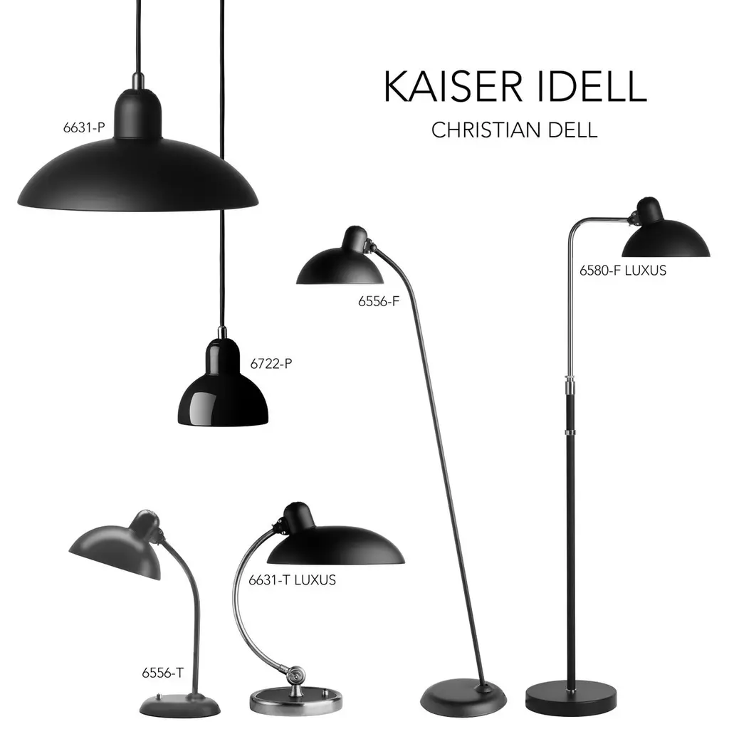 Christian Dell 'Kaiser Idell 6580-F' Floor Lamp for Fritz Hansen in Matte Black. Established in 1872, Fritz Hansen has become synonymous with legendary Danish design. Combining timeless craftsmanship with an emphasis on sustainability, the brand’s re-editions of iconic pieces from such Danish Modern greats as Arne Jacobsen, Hans J. Wegner, and Vico Magistretti pay homage to the originals while thoughtfully incorporating innovation and responsibly sourced materials.The renowned KAISER idell lamp, first produced in 1936, is characterized by Christian Dell’s ability to create elegant design with the basic hallmarks of Modernism: geometric shapes. Today, KAISER idell is widely recognized as a symbol of noble Bauhaus design. With its artful balance of an asymmetrical shade, a slender stem and an adjustable stem and shade for directional lighting, the 6580-F floor lamp provides ambient and task lighting in Dell’s signature style. Manufactured using the finest materials available to the exacting standards of Fritz Hansen. Price per item. Available in unlimited quantities in choice of glossy white, glossy black or matte black. Also available as a pendant, table lamp or as a non-adjustsble floor lamp (model 6556-F) - please see our separate listings. This listing is for the Kaiser Idell 6580-F floor lamp in matte black.In stock lead time of 1-3 weeks. Out of stock can add an additional 8 weeks or more. Please note that lead times, cost and inventory availability are subject to change without notice. Please inquire for current lead times prior to placing time sensitive orders.Accommodates 1x 60W equivalent standard medium base (e26) LED bulb. Ships with 79" black silicone cord with integrated foot switch. UL listed.Made to order. All sales final.