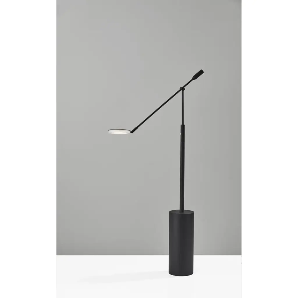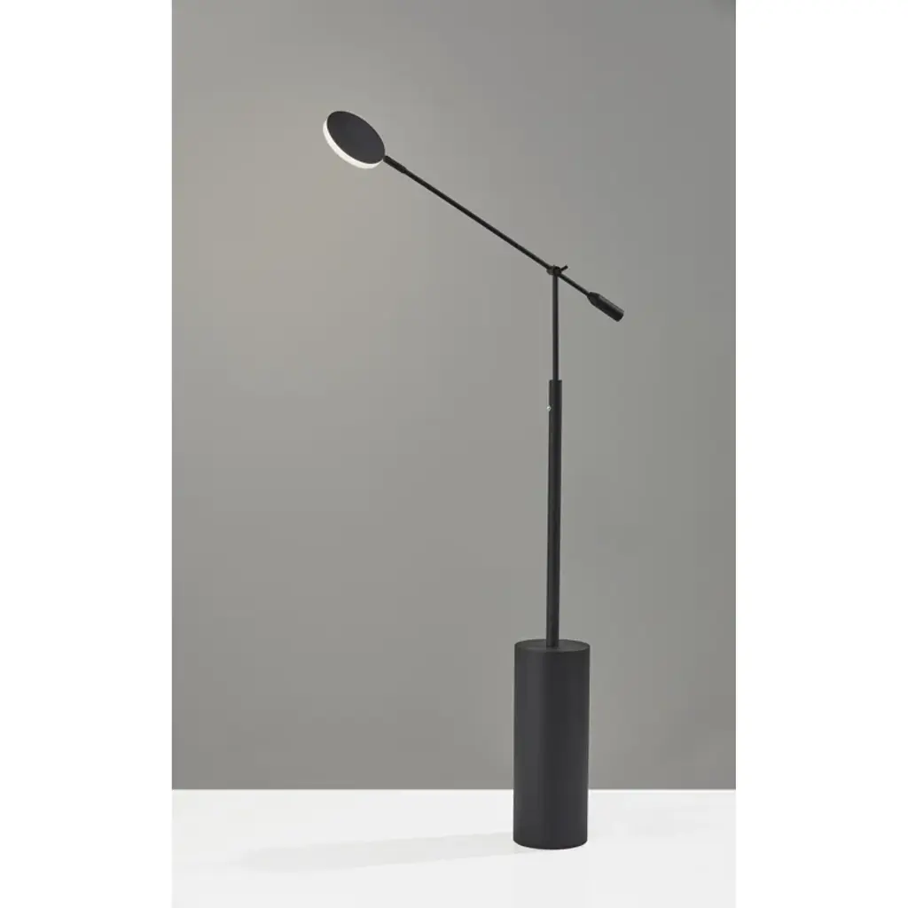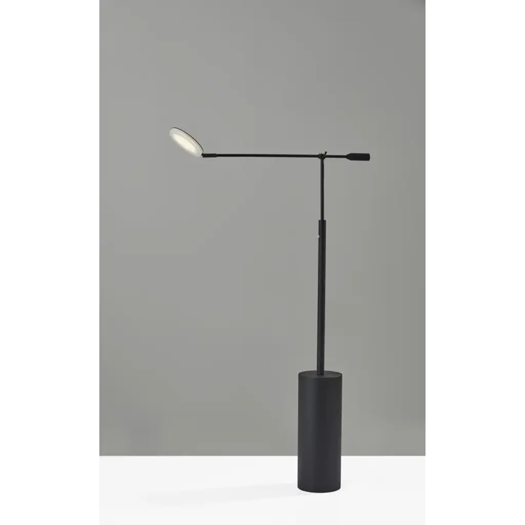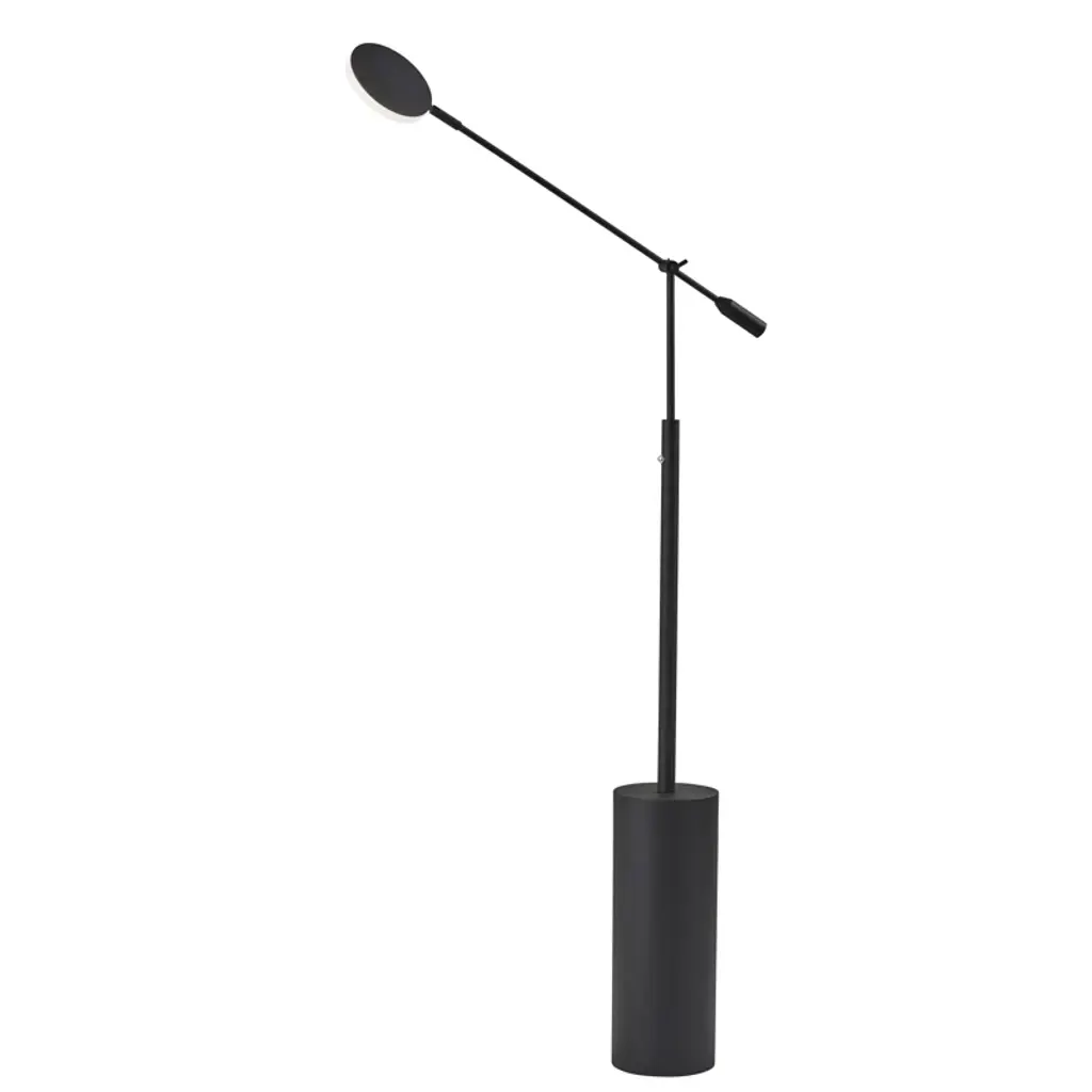 Focused light + Striking architectural design. This floor lamp draws on its adjustable task design to give you flexible light where you need it. Crafted from metal, it features a wide cylindrical base that rises up into a narrower arm. An adjustable hinge connects the base to the shade, and lets you move the light as needed. A disc shade sits at the end of the adjustable arm, with an integrated LED bulb inside a low-profile diffuser shade.