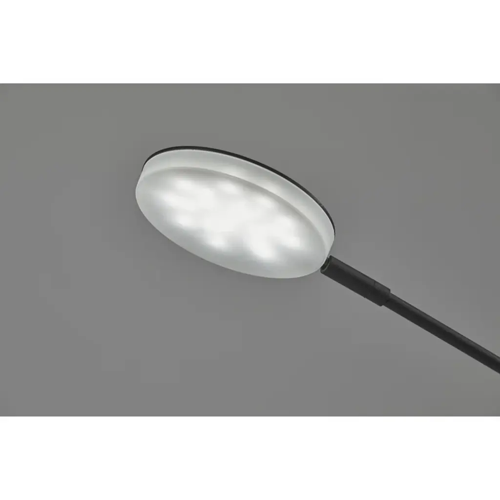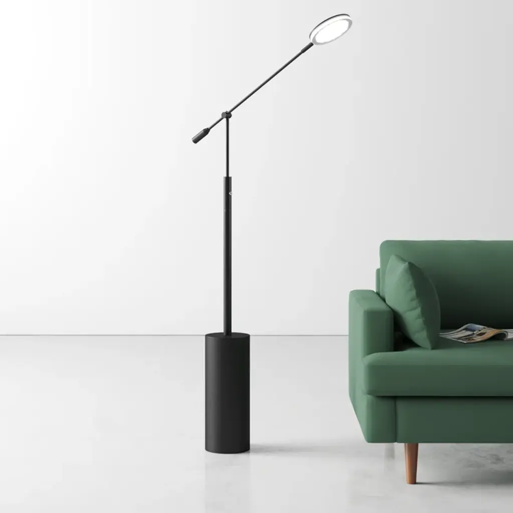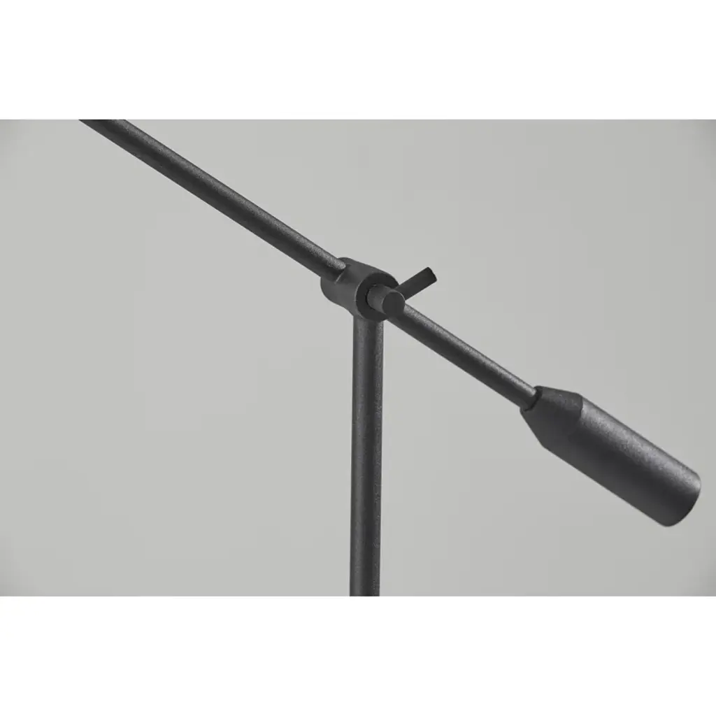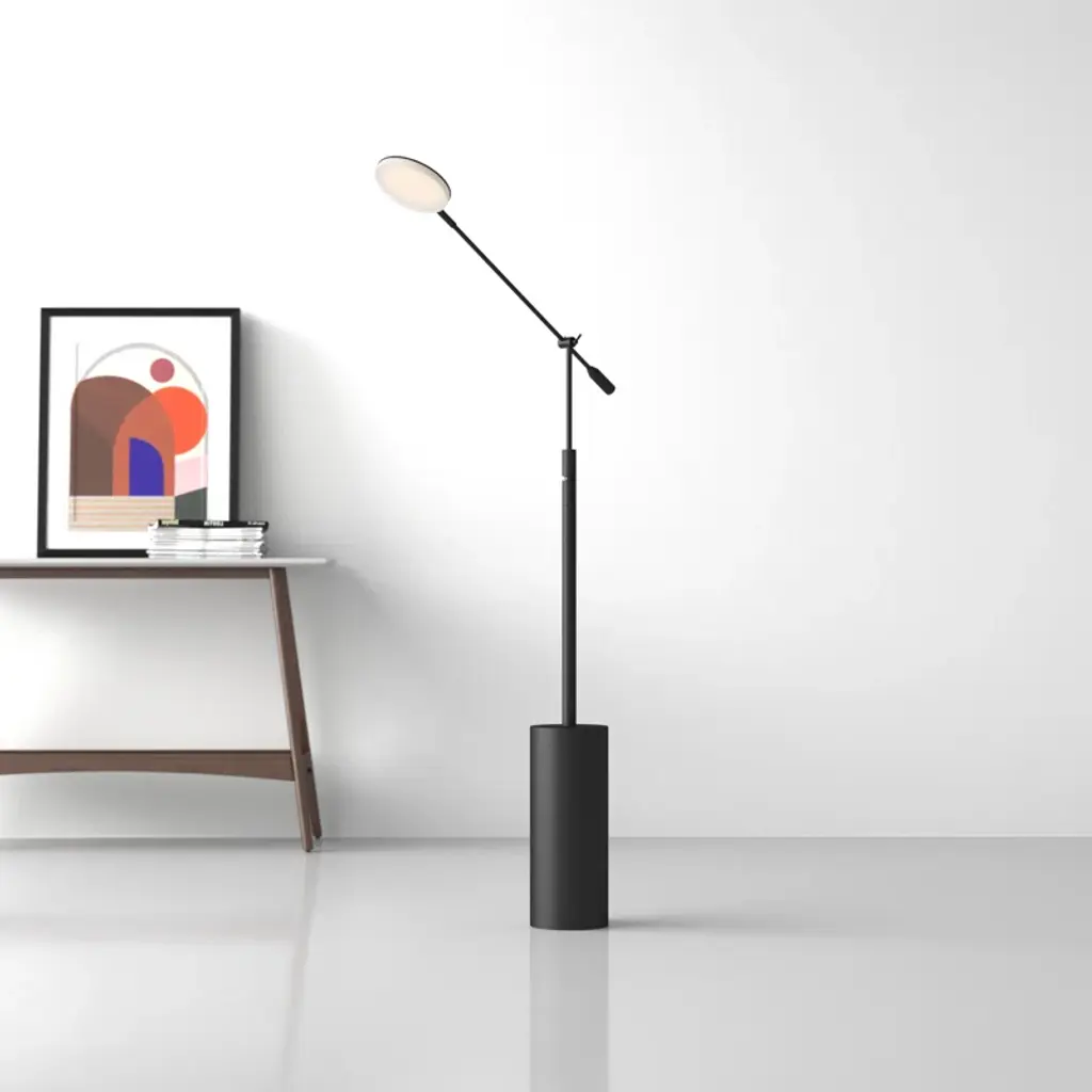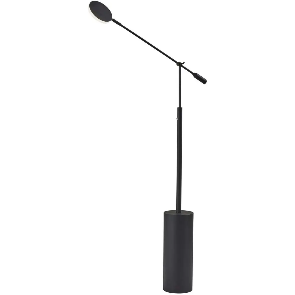 Focused light + Striking architectural design. This floor lamp draws on its adjustable task design to give you flexible light where you need it. Crafted from metal, it features a wide cylindrical base that rises up into a narrower arm. An adjustable hinge connects the base to the shade, and lets you move the light as needed. A disc shade sits at the end of the adjustable arm, with an integrated LED bulb inside a low-profile diffuser shade.