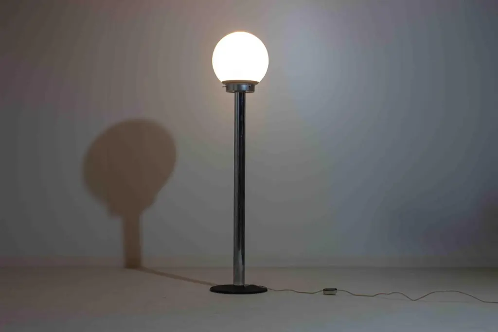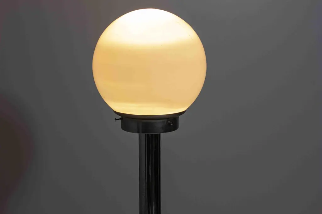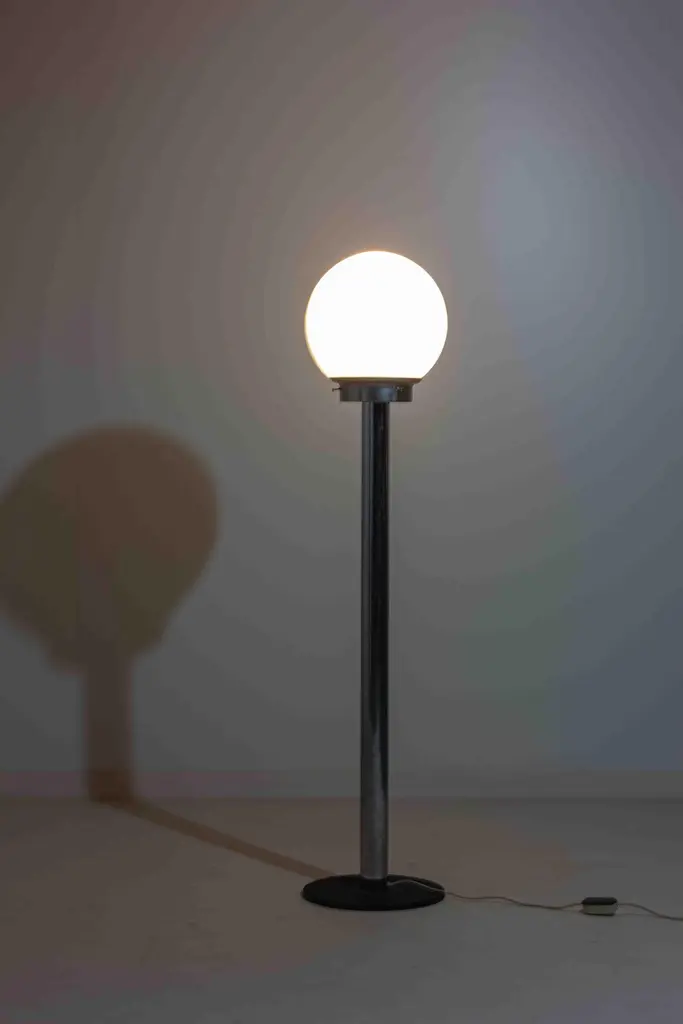 Striking floor lamp from Italy, made in the 1970s. The lamp features a tall chrome-plated stem and a large opaline glass globe that gives off a soft, warm light. Its clean, minimal look fits perfectly in both modern and vintage interiors. The heavy round base provides stability, and the original foot switch adds a nostalgic touch. Opaline glass was widely used in the 70s for its ability to diffuse light evenly, creating a cosy atmosphere without harsh shadows