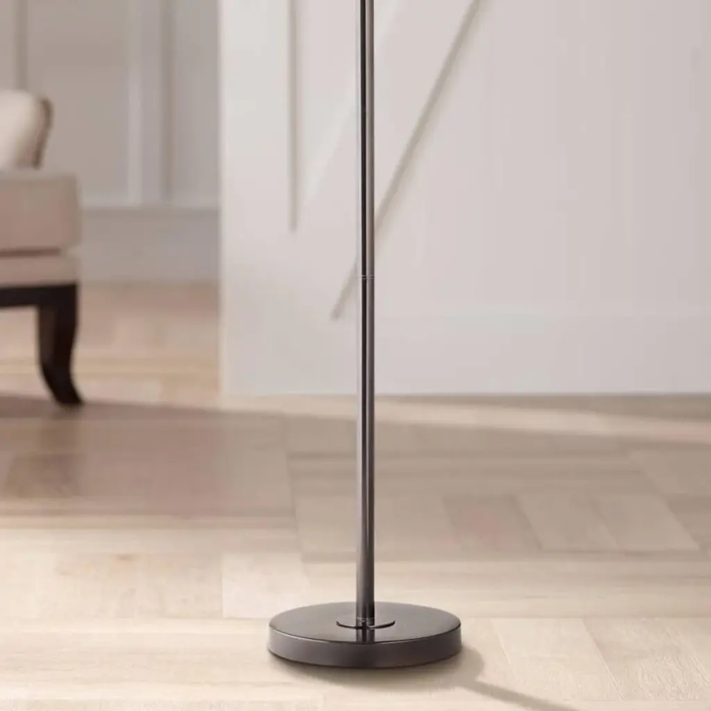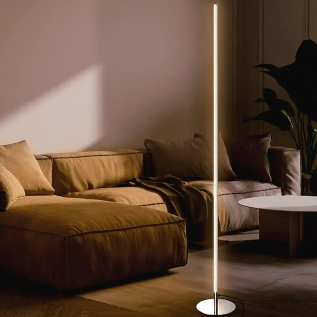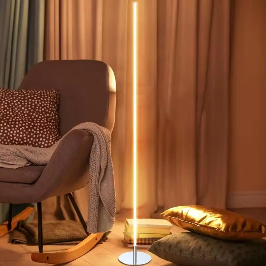 When a room calls for understated modernism, this floor lamp answers with the perfect balance of minimalism and statement-making design. The energy-efficient built-in LEDs cast a warm glow from the slim line bar base. Finished with a classic silk-wrapped cord, as beautiful displayed as hidden. Highlights Assembled dimension: 59.5 in. H x 8 in. W x 8 in. D Color: chrome Body material: metal Base material: metal 6 ft. black silk cord Max wattage: 21.5-Watt Dimmer switch Includes: 1-lamp(s) Minor assembly required Brightness: 1449-Lumen 3000K (soft white)