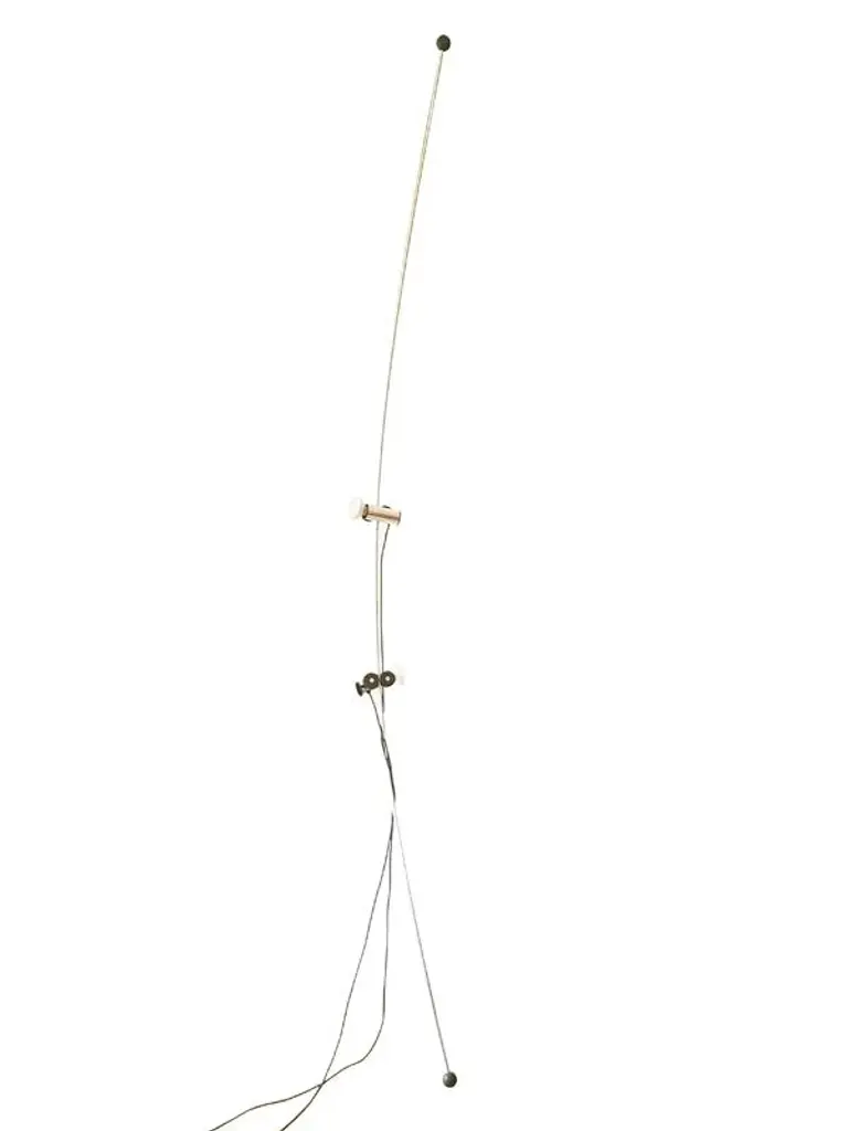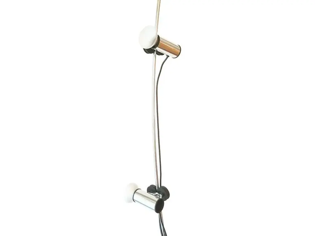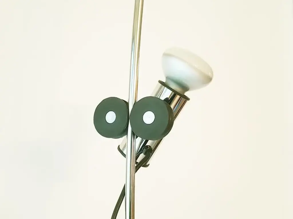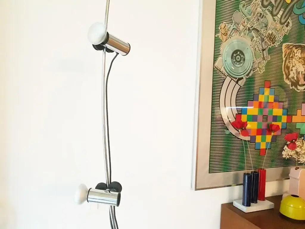 Floor to ceiling lamp mod. "Molla" design by C. Leonardi & F. Stagi for Lumenform in 1970s.This is a quite rare version with 2 light spots instead of 1. Thanks to the rubber rollers, the spotlights can slide along the flexible rod and be oriented in different directions. The extended rod measures 332 cm. the stability of the lamp is determined by the bending rod which, like a spring, adapts with a certain pressure to the height of the space. So the height and width of the lamp are relative. Very good vintage condition: The chrome plating has been hand-polished. One cylindrical lamp holder has a small loss of chrome plating, as shown in the photo. One switch has been replaced. I have official proof of authenticity such as vintage catalogs, designer records, or other literature sources and take full responsibility for any authenticity issues arising from misattribution, European Plug (up to 250V).The wiring of this item may be original and might need replacement, if not specified otherwise.