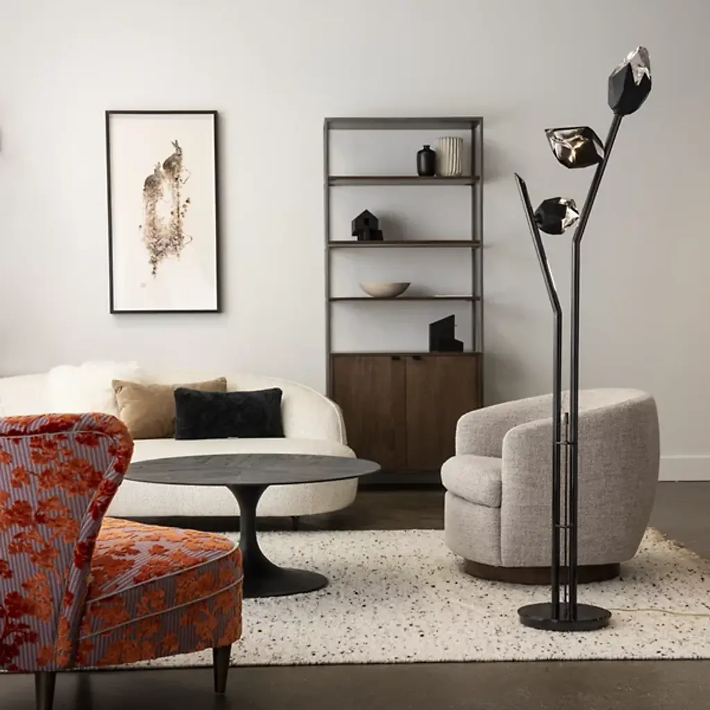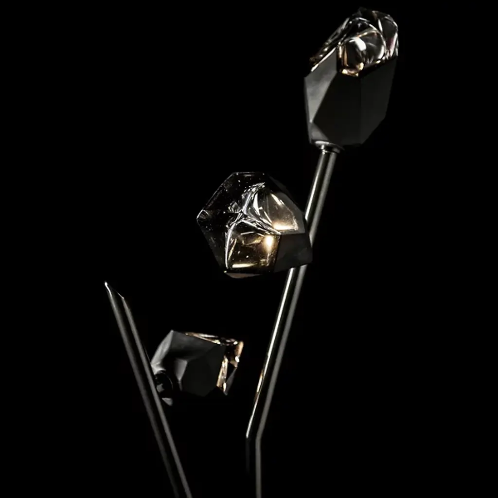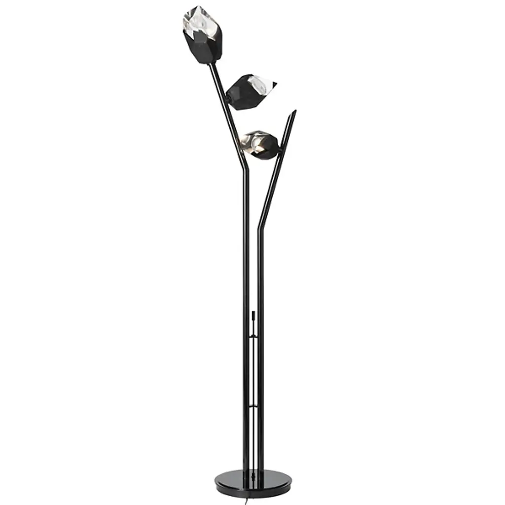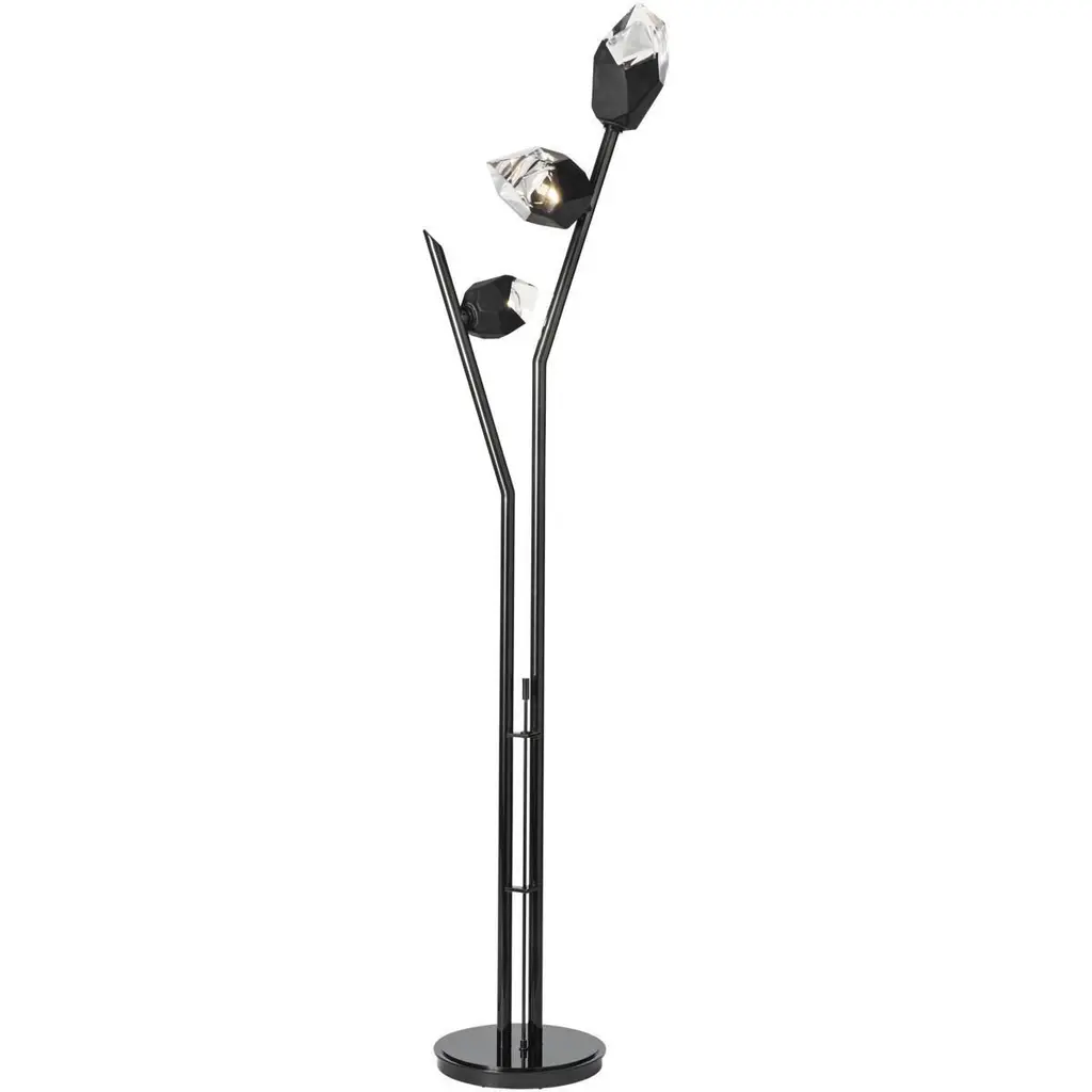 Let your artful design taste emerge with the Chrysalis Floor Lamp by Hubbardton Forge as a focal point. Like diamonds from lumps of coal, multi-faceted glass sparkles as it appears to break through opaque glass shells. Each thick glass element is blown by hand to create the desired artistic effect before being set atop the tall, angular metal stems. The brightness of the sparkle is easily controlled via a dimmer rod extending up from the base. Designed by Paul Marr-Hilliard and David Kitts.