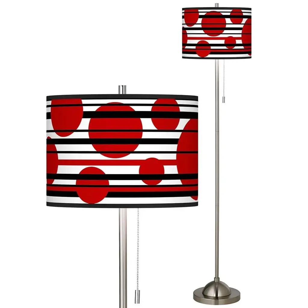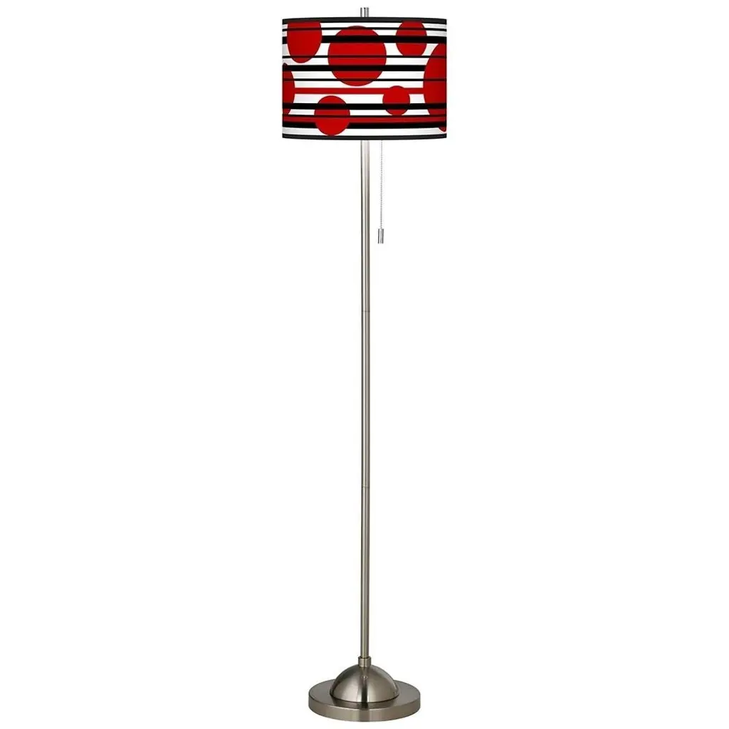 PRODUCT DETAILS: Overall: 62" high. Shade is 13 1/2" wide x 10" high. Base is 10" wide x 1 1/4" high. Takes one maximum 100 watt bulb (not included). Floor lamp with pull chain. Custom printed translucent shade with Red Balls pattern. Brushed nickel finish. DESCRIPTION: This floor lamp has a unique look, because it is paired with a giclee art shade. The shade is printed by the same technique used in reproducing museum-quality artwork. The base features a cool, brushed nickel finish.