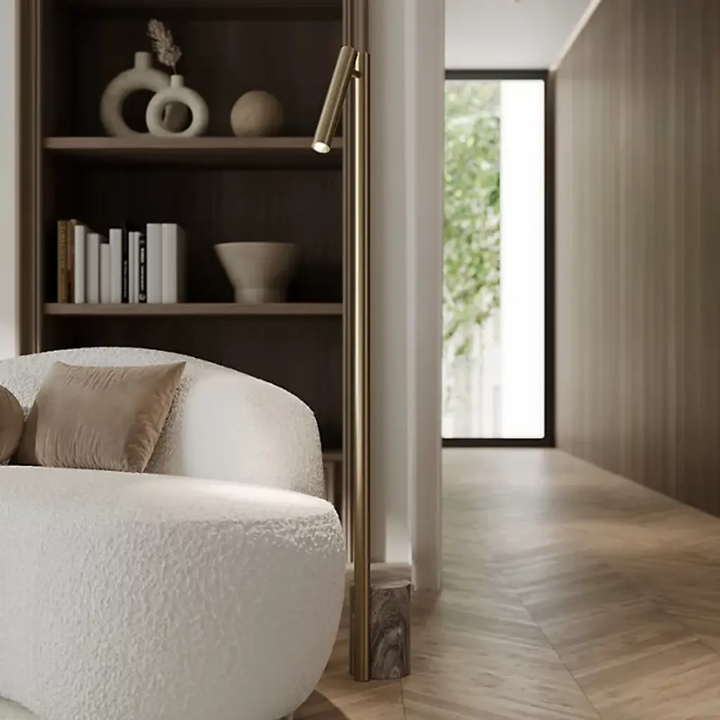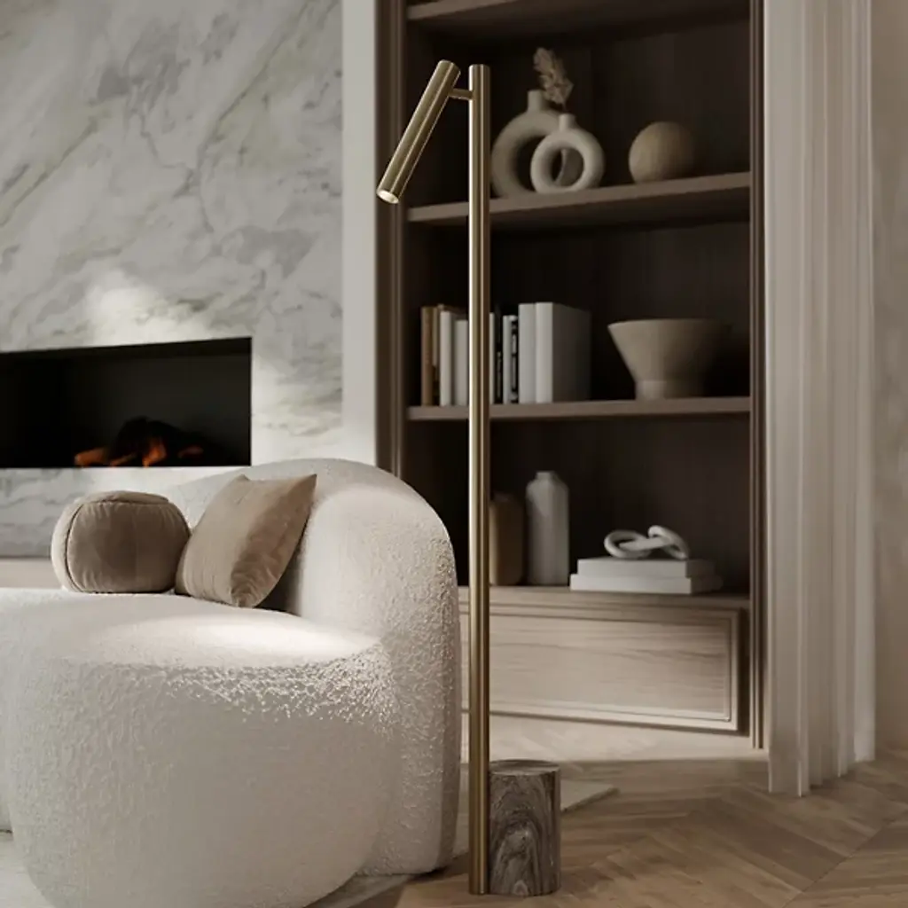 The Circleville LED Floor Lamp from Hudson Valley Lighting merges minimalist design with advanced lighting technology. Its offset, slim form is anchored by a marble base and extends upward to a separated, cylindrical shade. The shade’s 'Whisper' technology makes it easy to adjust, allowing for precise light coverage whether reading at a chair or lighting a darkened room. This piece demonstrates how industrial materials like steel and marble can be shaped into a work of art that feels right at home in residential spaces.