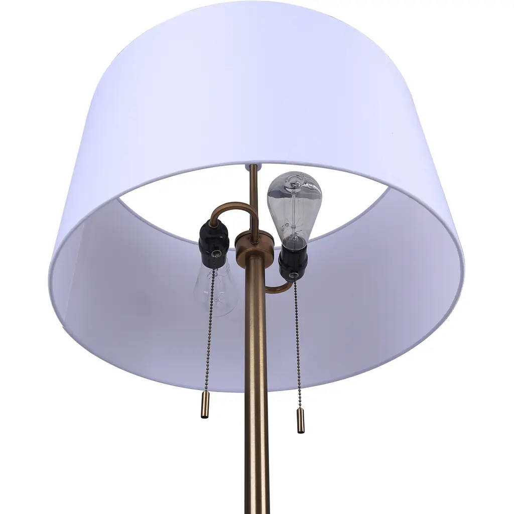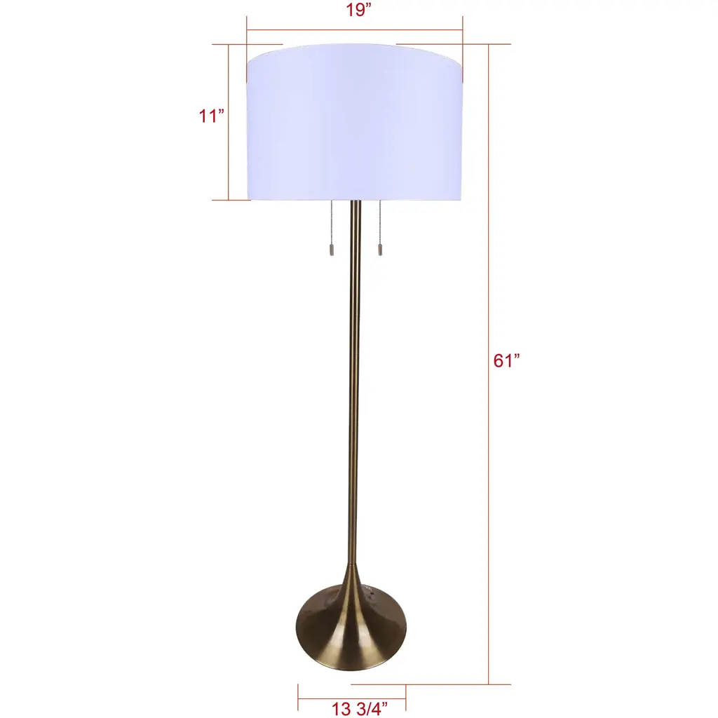 The Clara 2-Light Floor Lamp offers a blend of timeless elegance and modern style, making it a standout piece in any room. Featuring a chic gold finish paired with a white fabric shade, this lamp brings a sophisticated touch to your living room, bedroom, or office. With dual on-off pull chains, you can control each light individually, allowing for customized lighting depending on your needs. Standing 61 inches tall and 19 inches wide, this floor lamp is the perfect size to enhance the ambiance of any space. The durable metal construction and easy assembly make the Clara floor lamp a stylish and practical addition to your home decor.