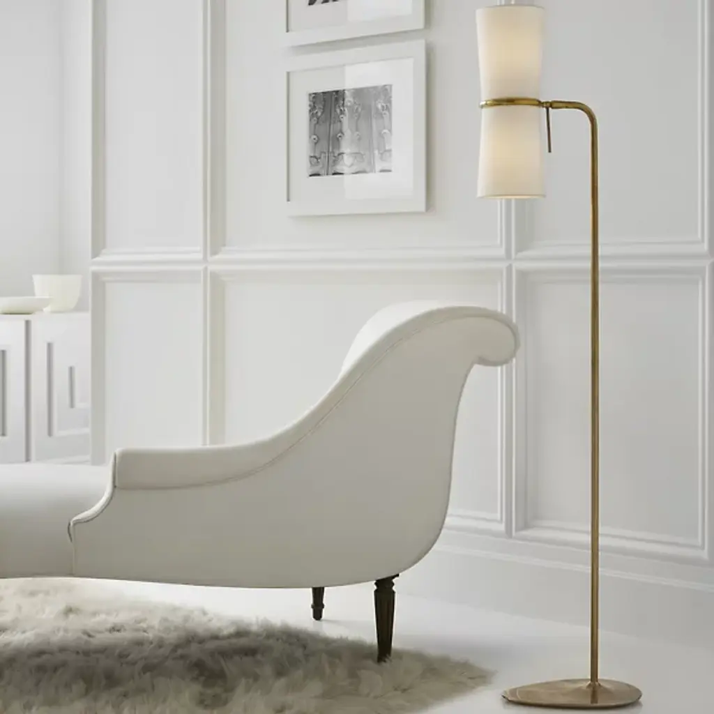 Fill your living space with light and levity with the Clarkson Floor Lamp by Visual Comfort Signature, formerly known as Visual Comfort, Its design features a slim, minimalist body (supported by a flat elliptical base) which wraps around a tapered Linen shade. The seamless quality of the shade spreads light out evenly for an ethereal, floating aesthetic, while the top and bottom openings allow for a more task-oriented effect.
