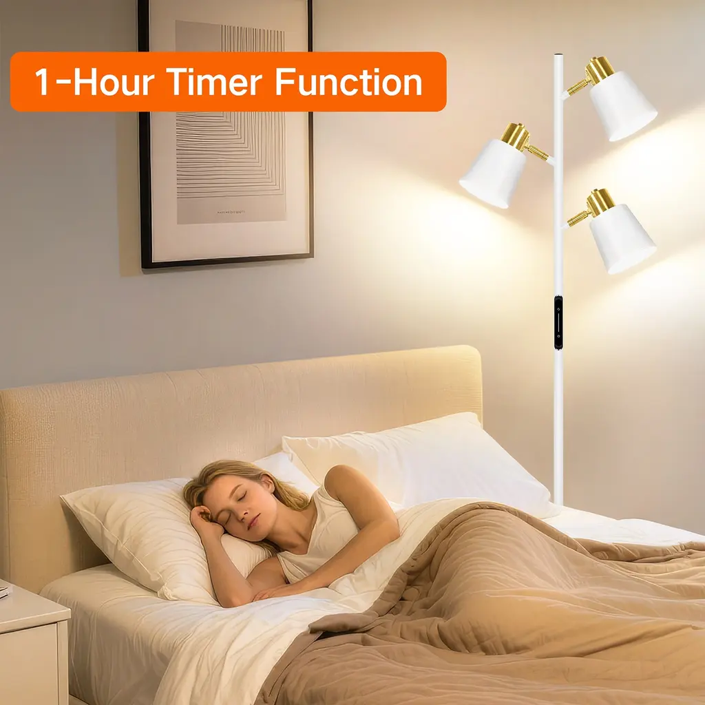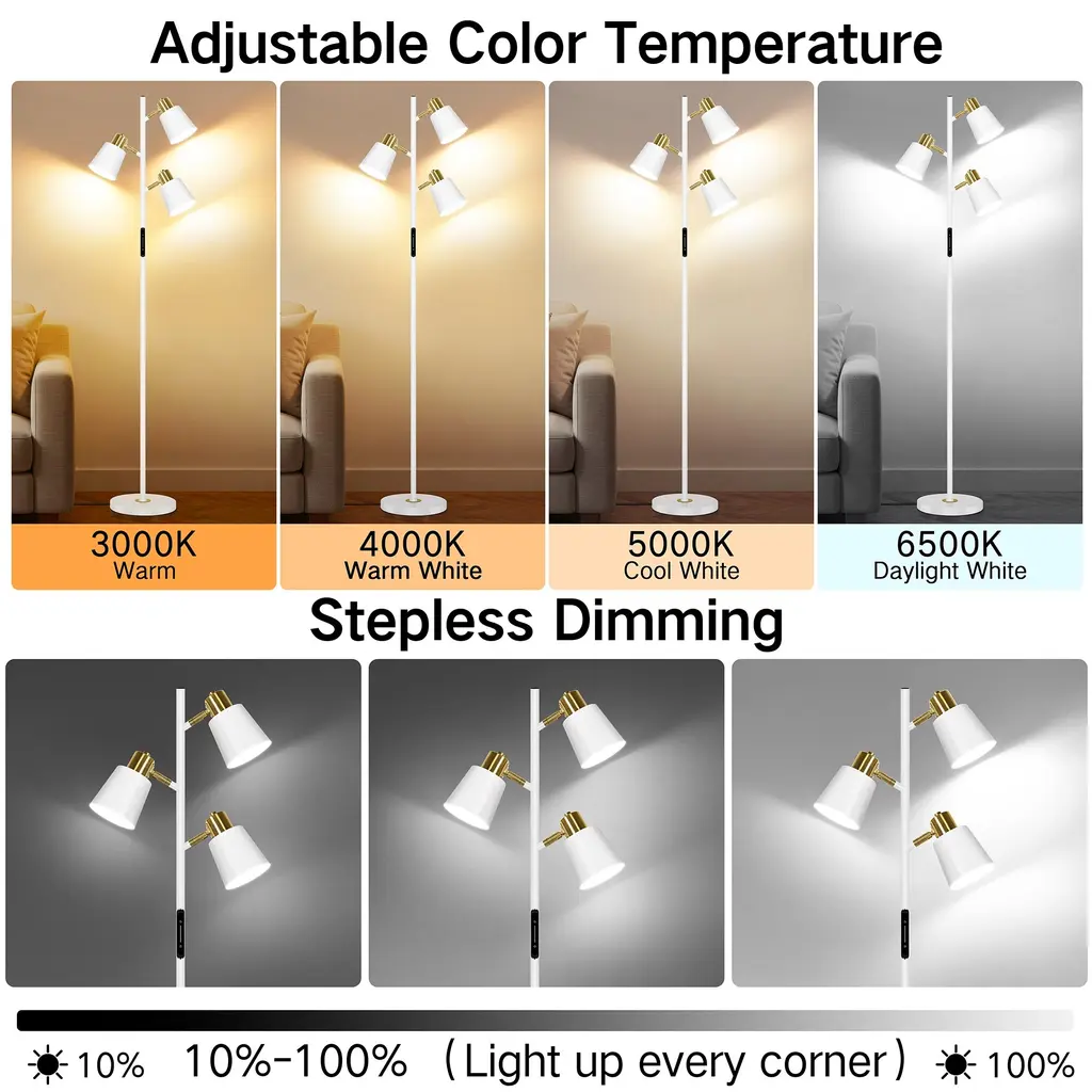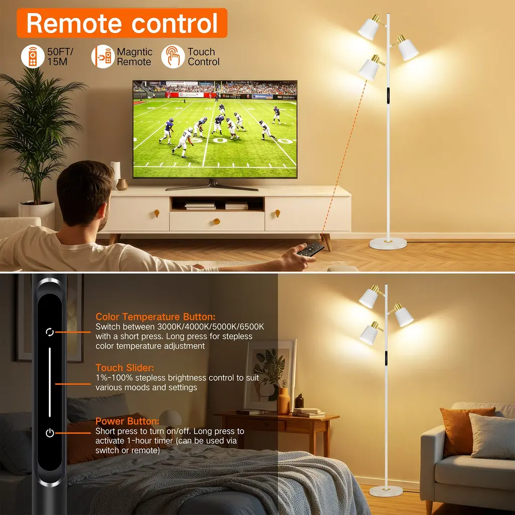 The 3-Head LED Floor Lamp with Slatted Iron Shade offers an ideal combination of style, functionality, and energy efficiency for your home or office. Featuring 3 adjustable heads, this lamp provides customizable lighting with 3 different color temperatures (3000K, 4000K, 5000K, 6500K) and a dimmable range from 1% to 100%. The integrated touch slider and remote control make it easy to adjust both brightness and color temperature to suit any task or mood. With a maximum power output of 36W and 900 lumens per head, this lamp ensures a bright, warm glow that is gentle on the eyes and perfect for long hours of use. The energy-efficient LED bulbs have a lifespan of up to 50,000 hours, saving you money on energy bills while reducing the need for frequent bulb replacements. The sleek iron construction and minimalistic design fit seamlessly into any modern or industrial-style decor. With a sturdy base weighing 2.5kg, this lamp is stable and won't tip over, making it ideal for homes with pets or children. Its built-in 1-hour timer helps you wind down for the night, and its memory function recalls the last settings for your convenience. Features 🌟