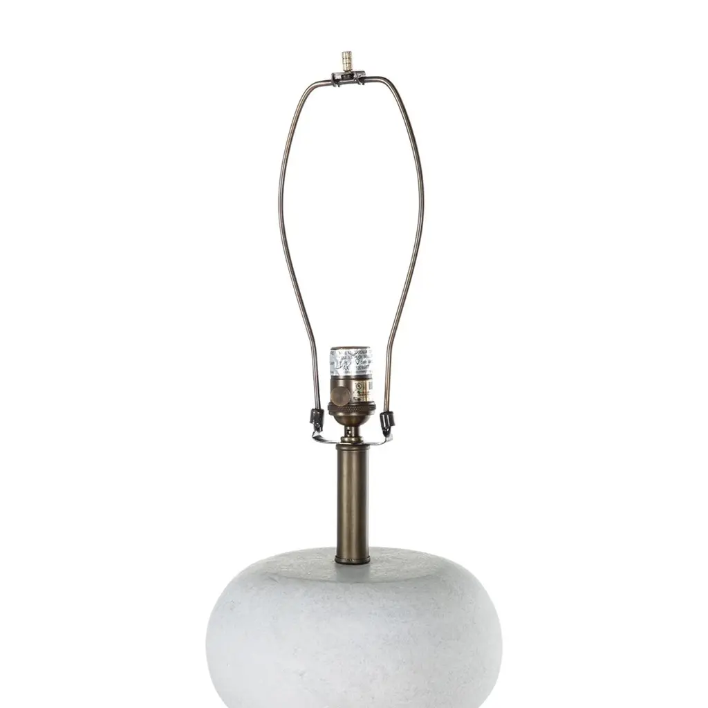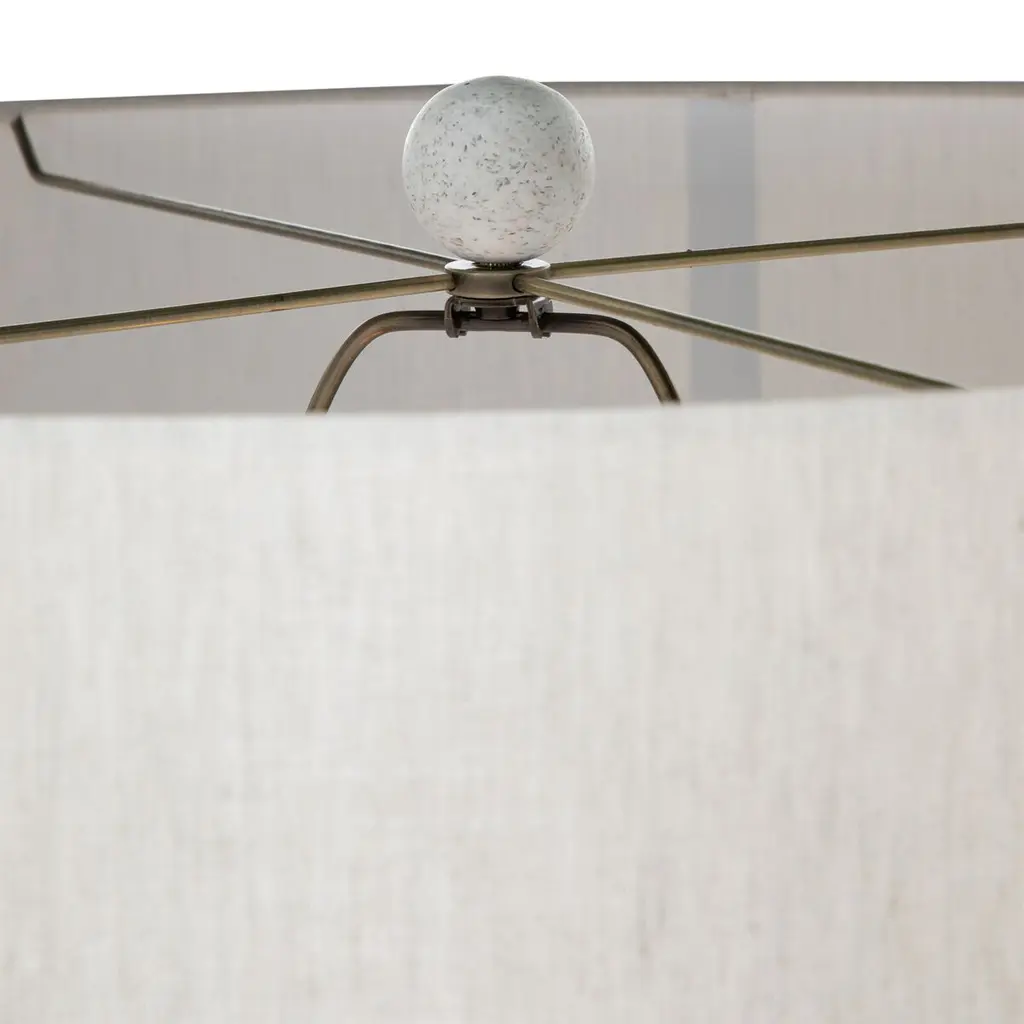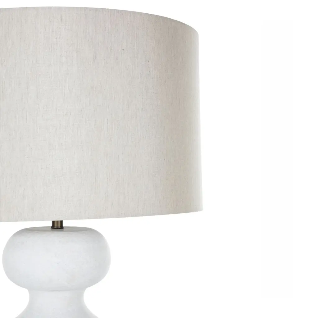 This floor lamp's handcrafted white plaster finish complements its sculptural silhouette. Standing six feet high, it's topped with a sleek smoky gray shade.