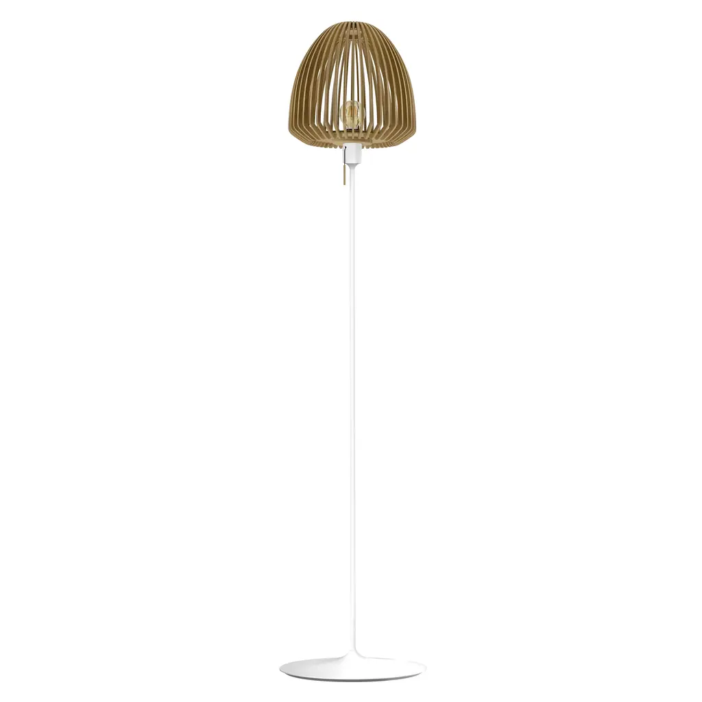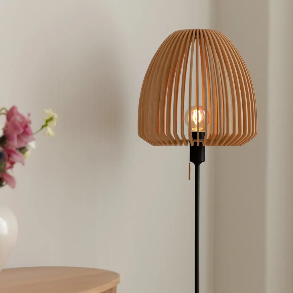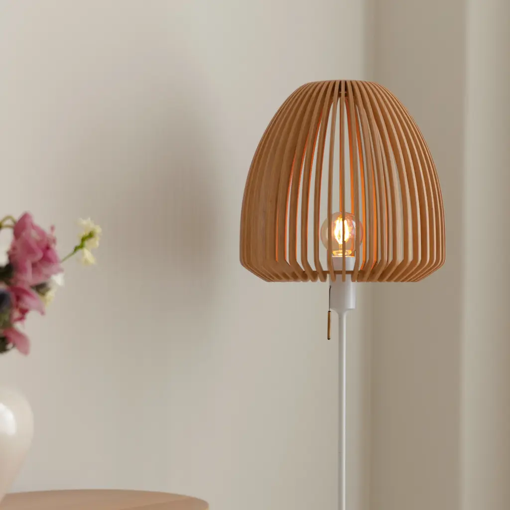 The Clava Wood Floor Lamp features a lampshade crafted from laser-cut wooden lamellas, casting beautiful patterns of light on surrounding walls. The clean lines of the wooden lamellas make the Clava Wood suitable for various spaces, enhancing dining areas, hallways, or bedrooms. When paired with the Santé floor light stand, it becomes a stylish floor lamp, perfect for placement near a sofa or in a cozy corner. The Clava Wood lampshade is available in oak, dark oak, and black oak finishes.