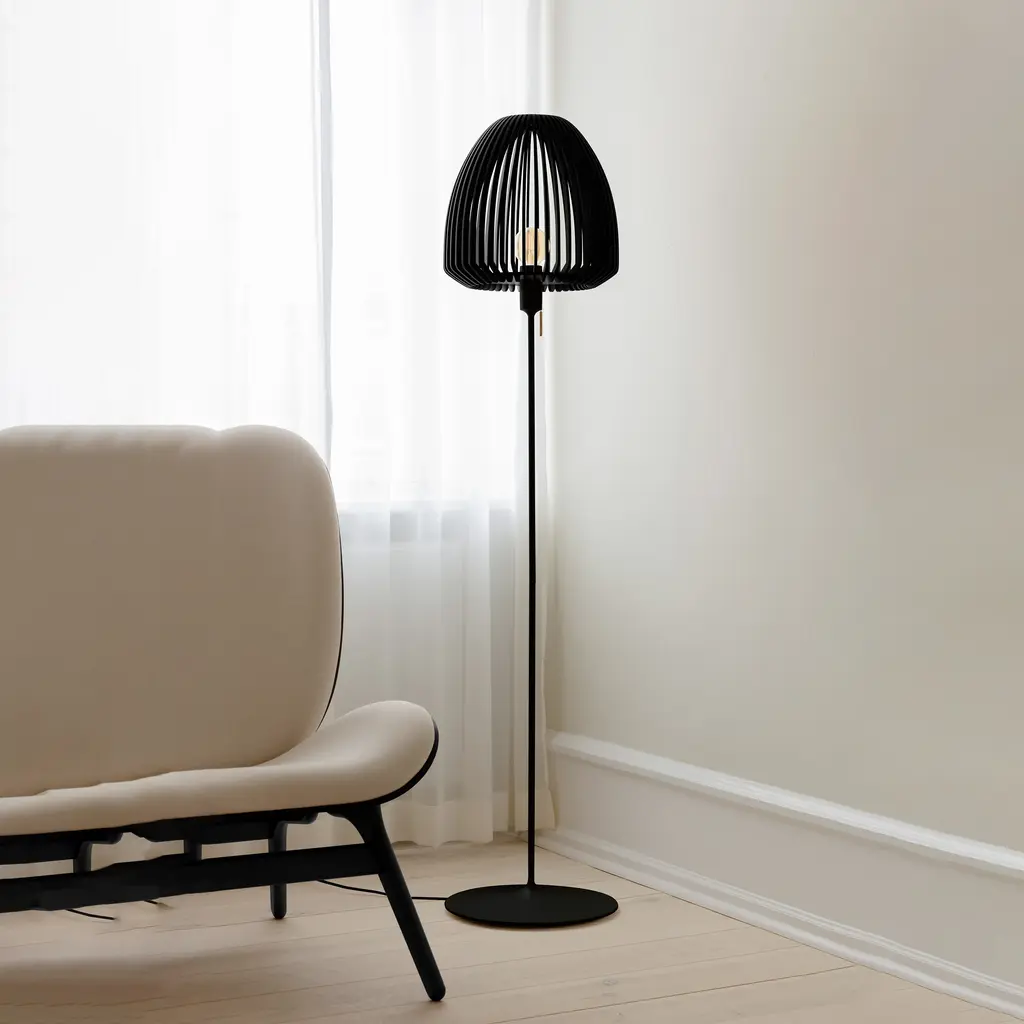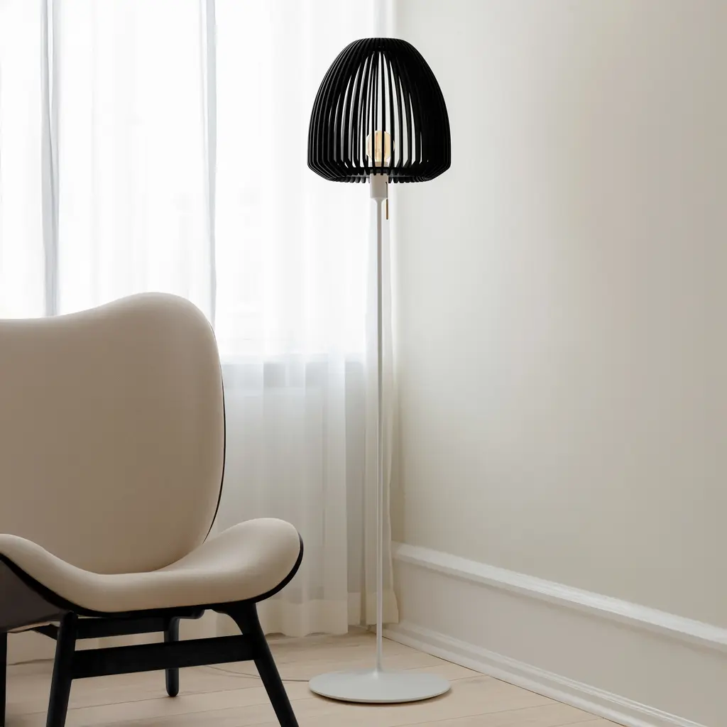 The Clava Wood Floor Lamp features a lampshade crafted from laser-cut wooden lamellas, casting beautiful patterns of light on surrounding walls. The clean lines of the wooden lamellas make the Clava Wood suitable for various spaces, enhancing dining areas, hallways, or bedrooms. When paired with the Santé floor light stand, it becomes a stylish floor lamp, perfect for placement near a sofa or in a cozy corner. The Clava Wood lampshade is available in oak, dark oak, and black oak finishes.