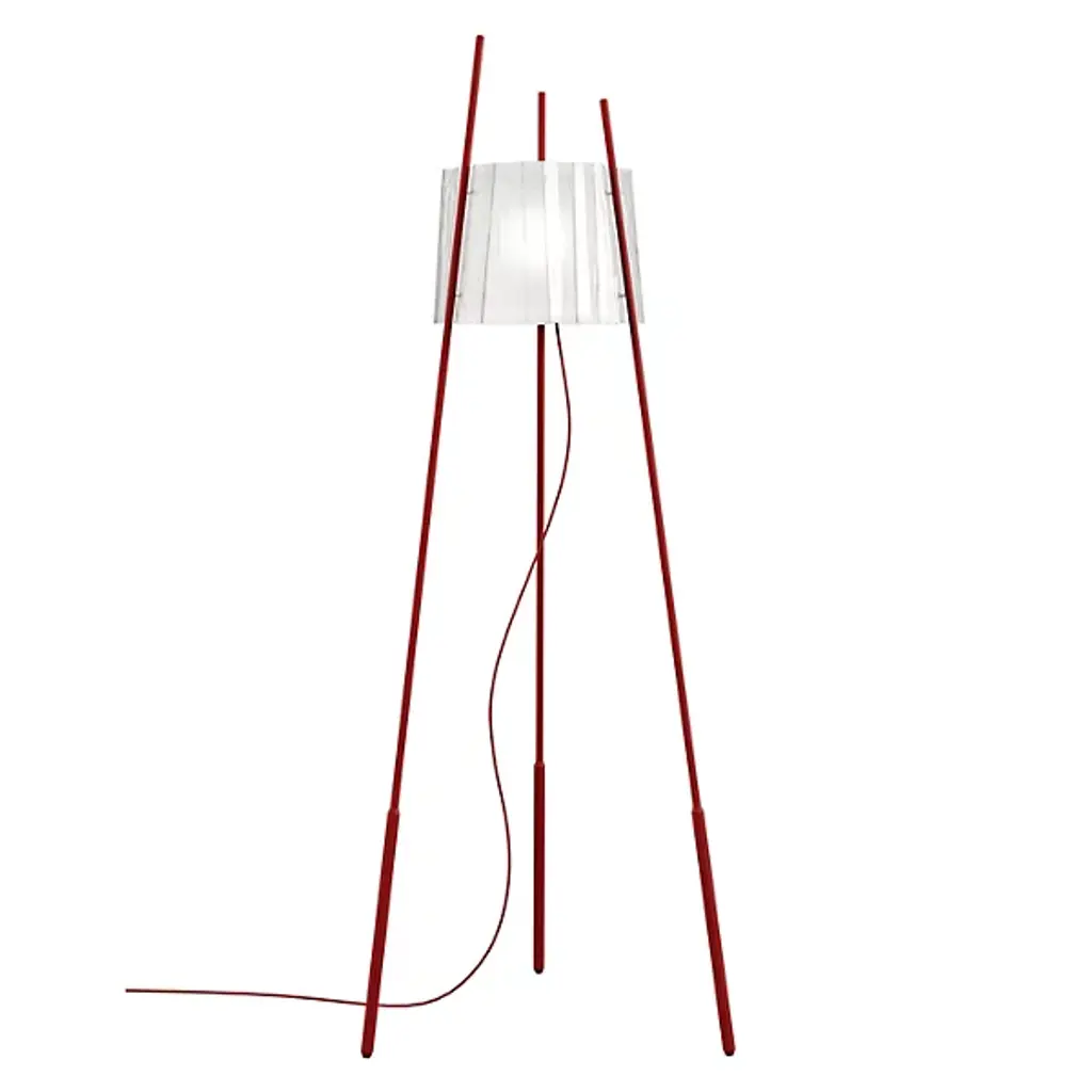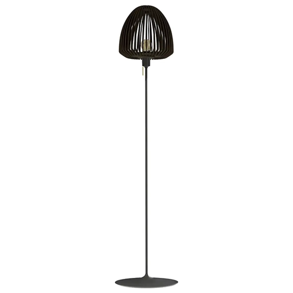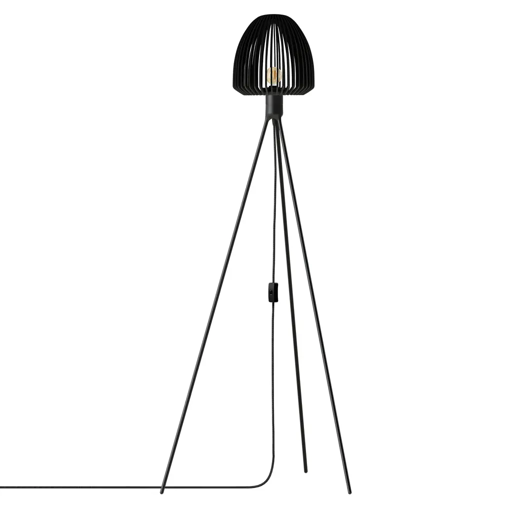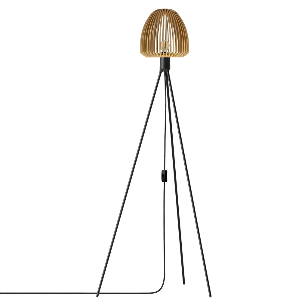 The Clava Wood Tripod Floor Lamp pairs a laser-cut wooden lampshade with a minimalist tripod stand, creating a distinctive lighting piece. The wooden lamellas produce intricate light patterns that bring warmth to a space. Available in oak, dark oak, and black oak finishes. It works well in living rooms, bedrooms, or reading nooks.