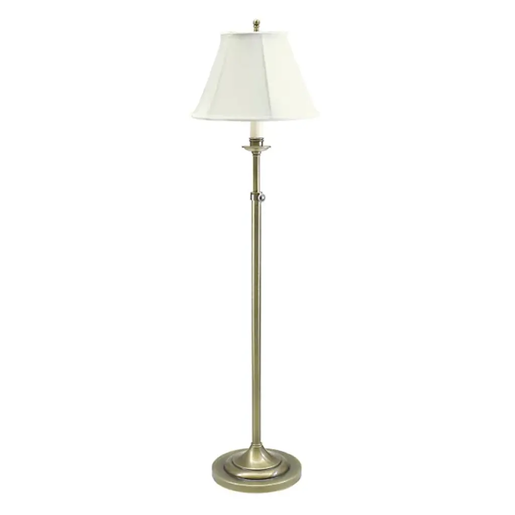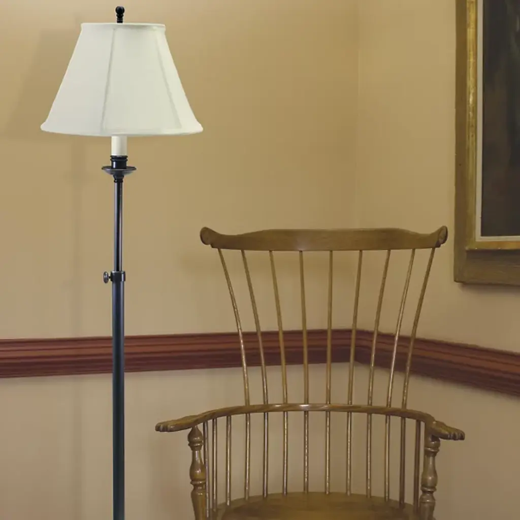 The Club Adjustable Floor Lamp from House of Troy is a glamorous blend of transitional and contemporary styles. Its LED rests on a discreet bobece crowned by an intricate softback linen shade. The framework tapers at the bottom, composed of metal, uniting with a circular baseplate. The shade has defined lines that present sloping silhouettes, drawing your eye. An on/off socket switch allows for easy operation. The height of the floor lamp can be adjusted for your convenience.