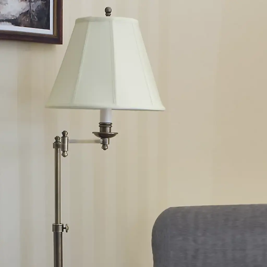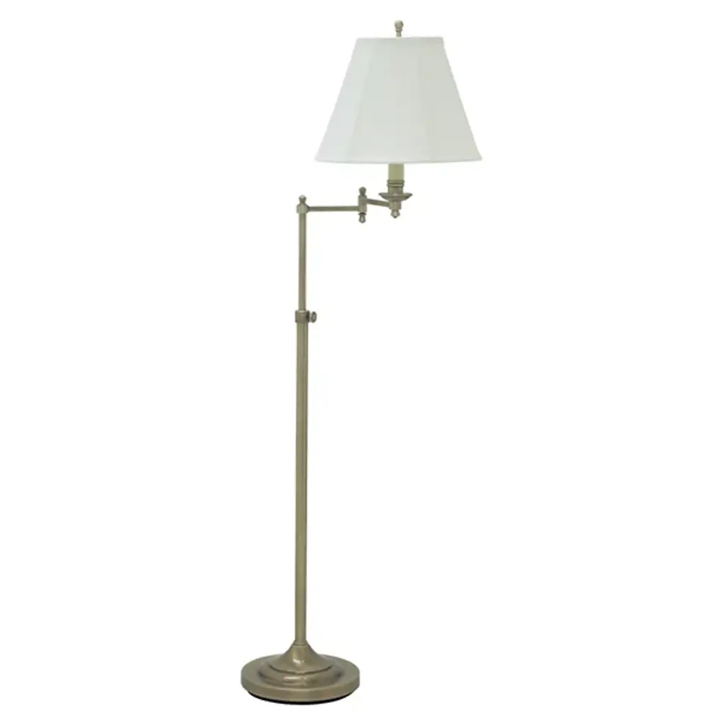 The Club Adjustable Swing Arm Floor Lamp from House of Troy blends mid-century modern aesthetics and functionality. It is composed of durable metal that forms a streamlined body crowned by a softback linen shade with clearly defined lines forming sloped silhouettes. Its LED is placed on a bobeche under the shade, emanating a warm glow. The swing arm allows easy rotation, and height adjustability adds to the lamp’s customization. Turn the lamp on and off using its socket switch.