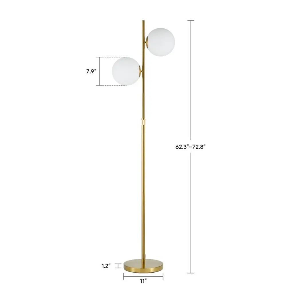 Brighten up your space with the contemporary charm of this tree floor lamp! Crafted with delicately designed white glass shades and a sophisticated modern brass finish, this light fixture radiates elegance that goes with any interior style. The soft glow from the lampshades casts a serene aura wherever it stands, be it a cozy reading nook, an inviting living room corner, or a tranquil bedroom retreat. With an adjustable pole offering flexibility, you can effortlessly direct the light upwards or downwards to harmonize with your space's unique layout.