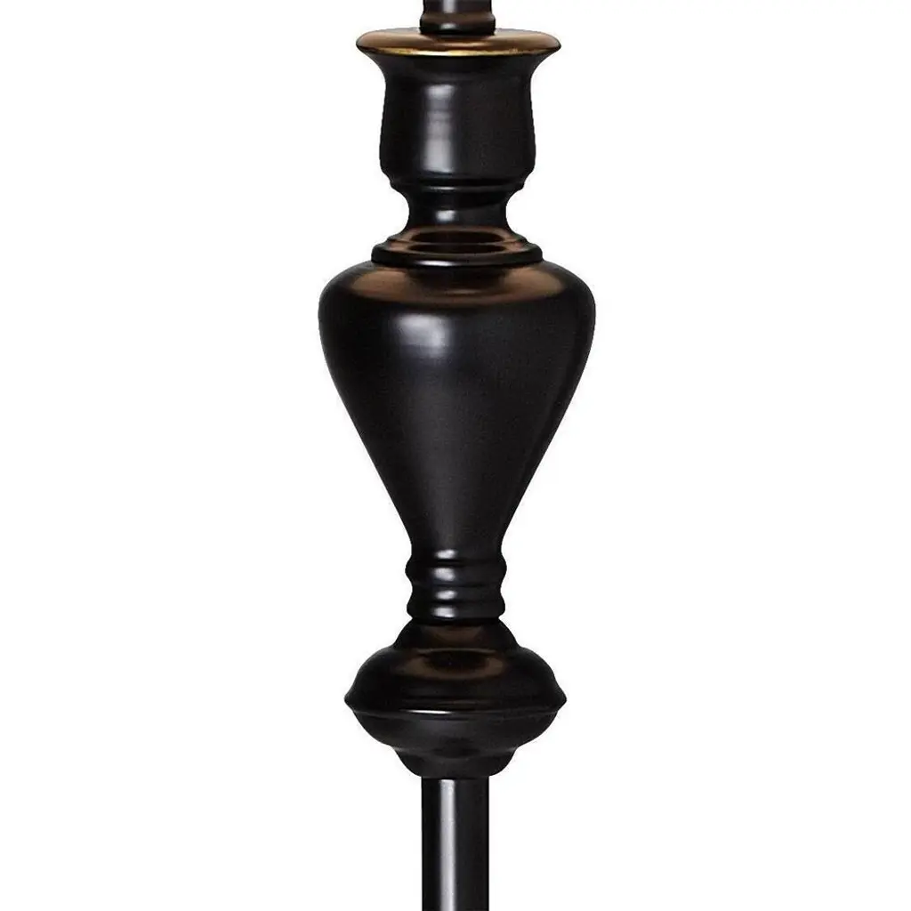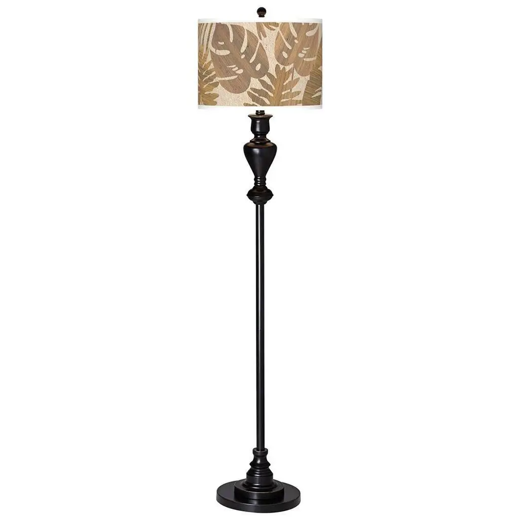 PRODUCT DETAILS: Overall: 58" high. Shade is 13" wide x 10" high. Base is 10" wide. Takes one maximum 150 watt bulb (not included). On-off rotary switch. Stylish floor from Giclee Glow - perfect for living rooms, family rooms, and more. Black bronze finish with soft gold edging. Metal construction. Custom-printed giclee lamp shade with Tropical Woodwork pattern. DESCRIPTION: Add a stylish and unique accent to your living space with this shapely floor lamp which is topped off with our patented Tropical Woodwork pattern giclee shade. Warm light shines through illuminating the pattern and creating a truly distinctive look.