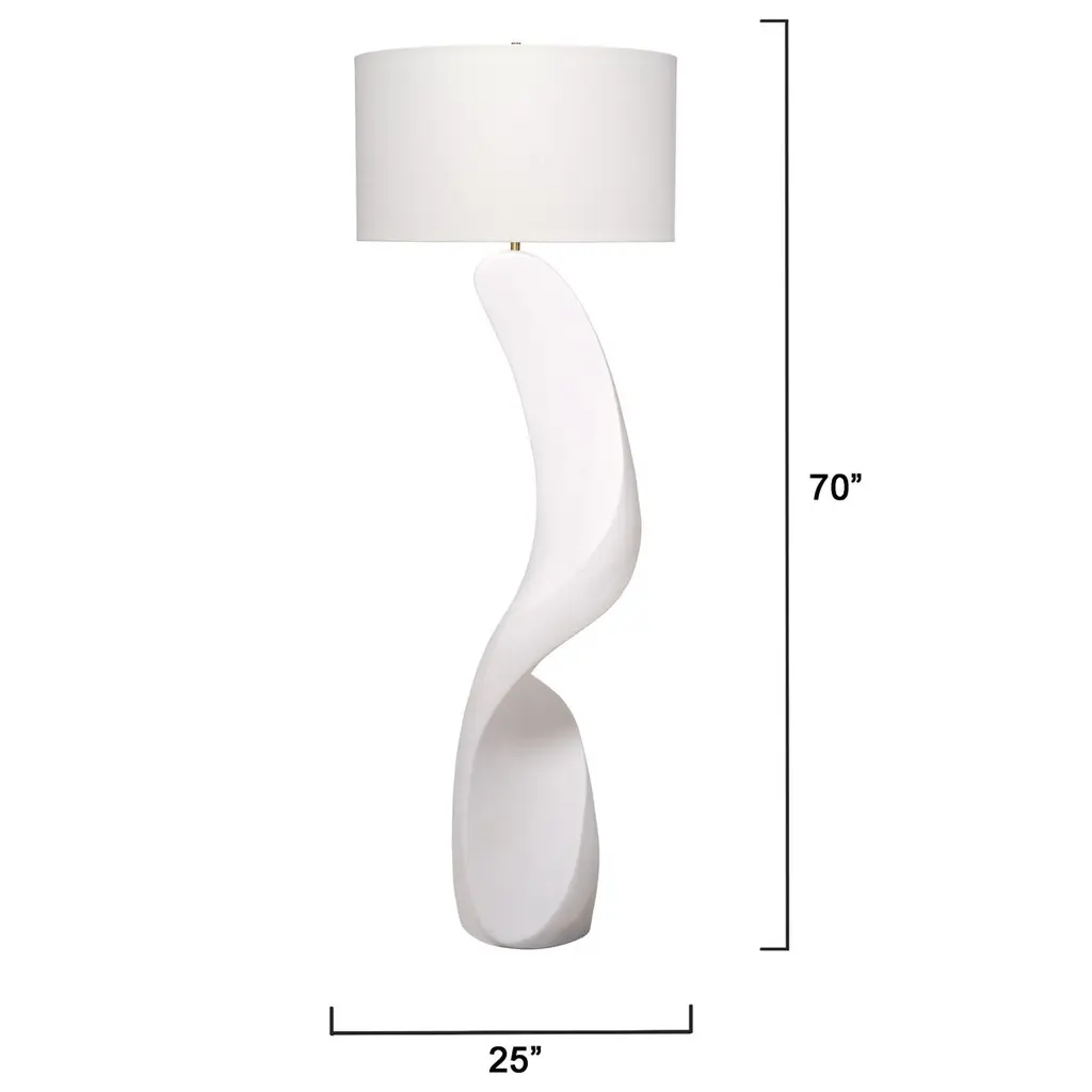 This breathtaking lamp’s sculptural base features an abstract swoop that sinuously rises from the earth, embracing and obscuring its internal hardware. The eye is drawn upward to a white linen drum shade floating serenely above it all. Formed from ricestone—a unique substance that combines natural quartz crystal with resin—it creates a dramatic look that enhances decors from contemporary to coastal.