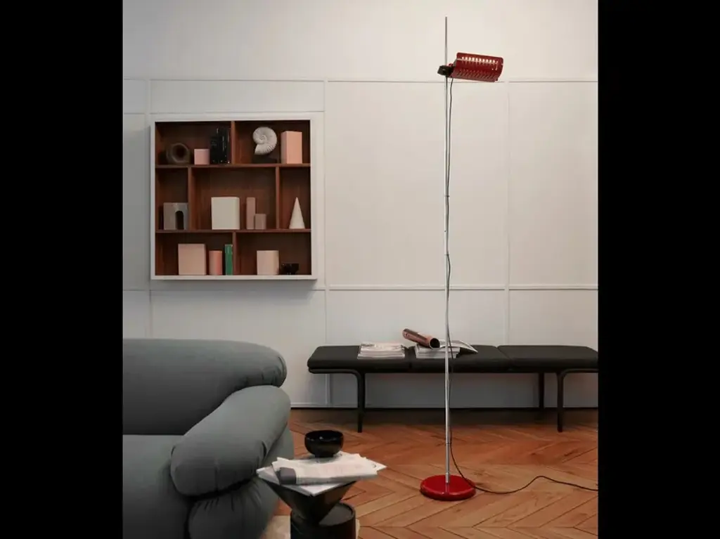 In 1970, the "Colombo", named after its designer, the great Joe Colombo, was the first domestic light with a halogen light bulb and its design came in response to the invention of the new light source.Floor lamp with dimmer giving direct and indirect light, lacquered steel base, chromium-plated stem, height adjustable reflector in lacquered aluminium.6261 x max 24W (LED)2700°K 3300 lm CRI>85 (dimmer)↑ 205 cm ↔ 24 cm↑ 80,8" ↔ 9,4"Structure: metalStructure color: chromium platedDiffuser/Reflector: aluminiumDiffuser/Reflector color: Black/chromium plated stem, Scarlet red/chromium plated stem, Anodic bronze/black stemCertifications: CE