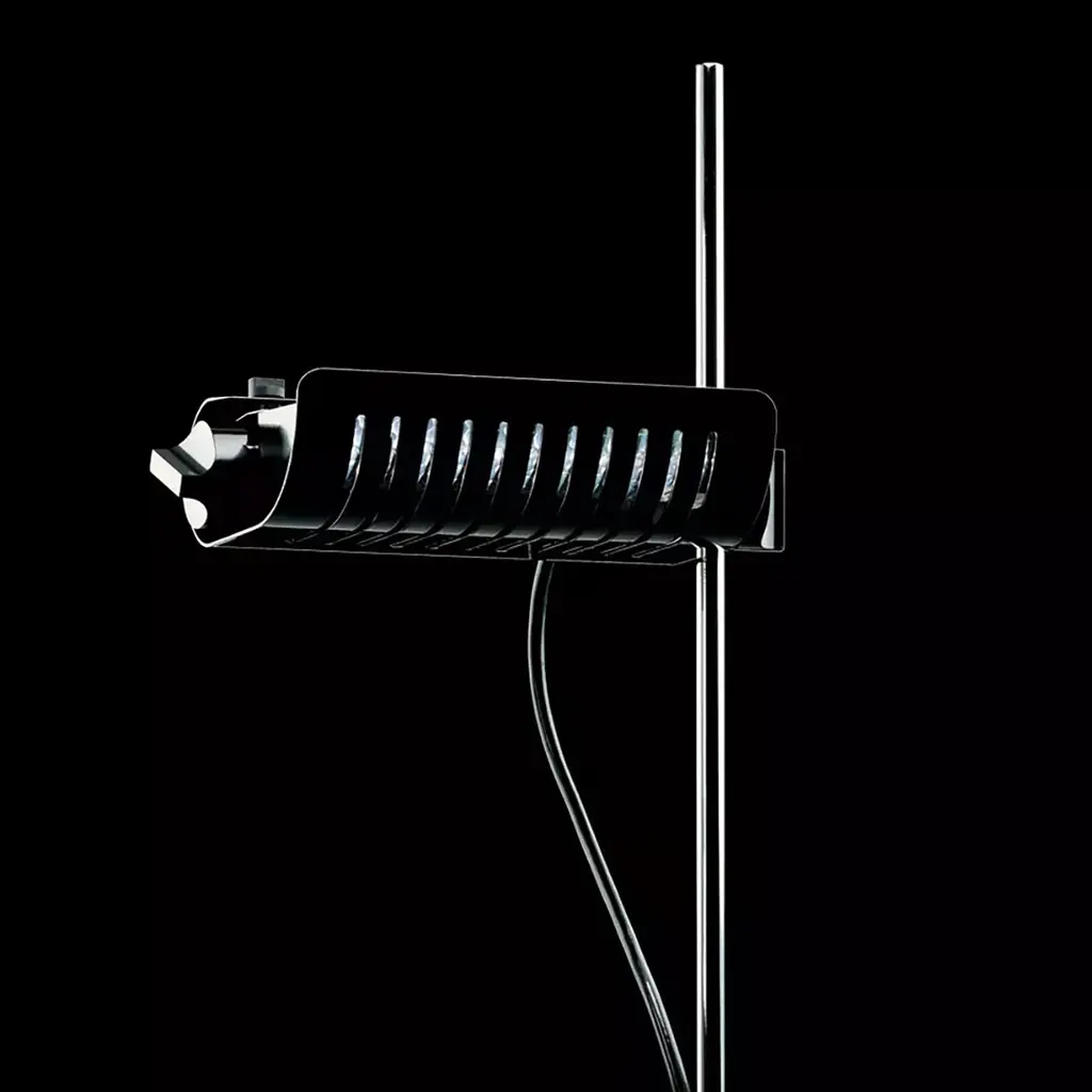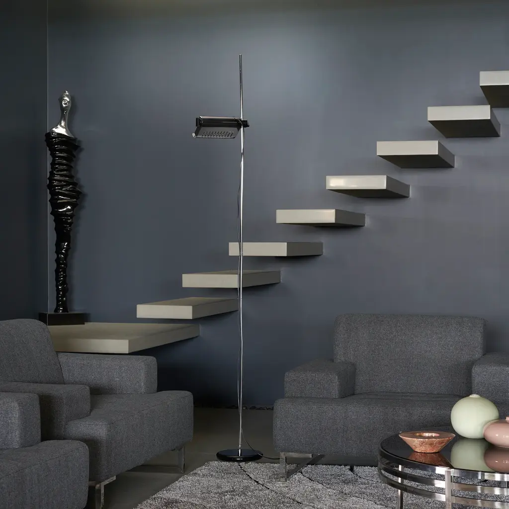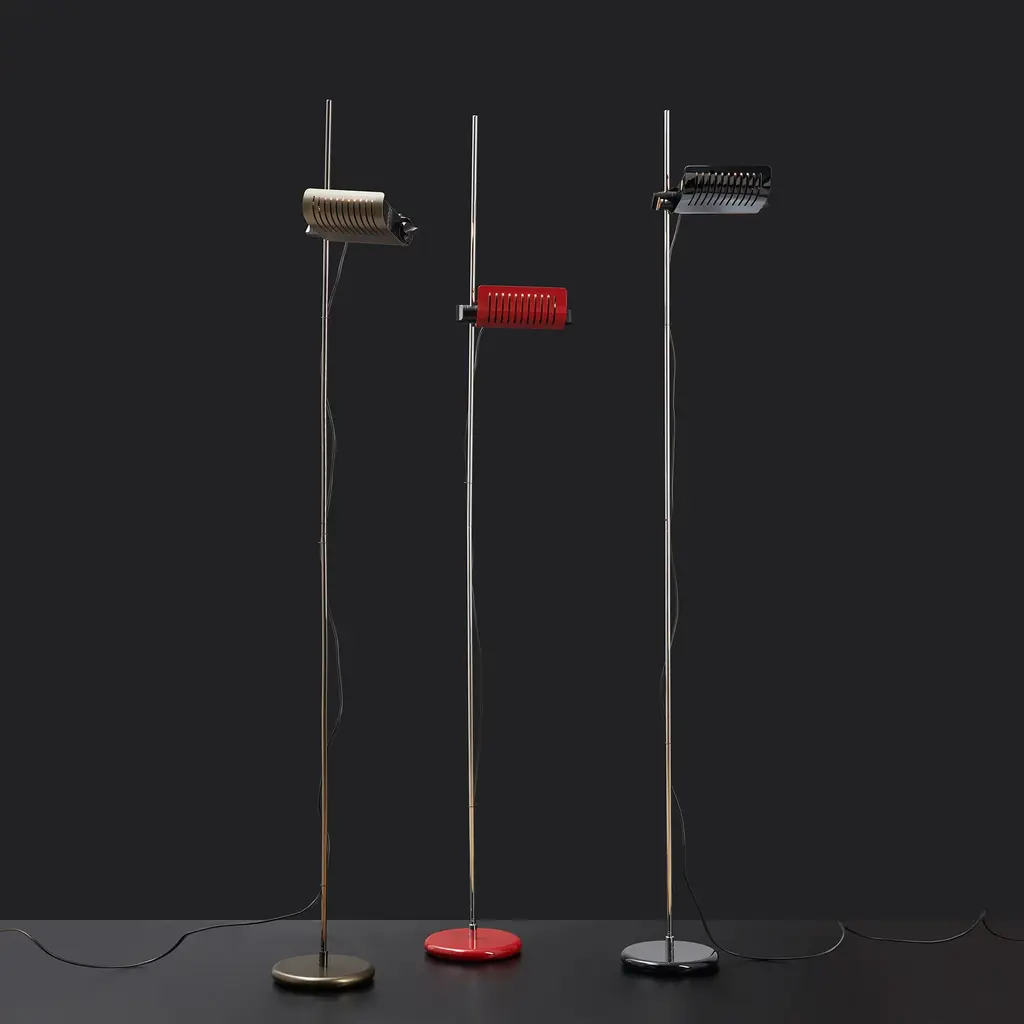 The Colombo Floor Lamp, designed by Joe Colombo in 1970, features a lacquered steel base, a chrome-plated stem, and a pivoting aluminum reflector, enabling both direct and indirect lighting. Equipped with a dimmer, it allows easy control over lighting levels, making it ideal for various settings. Available in finishes black, bronze, and red, the Colombo lamp brings both functionality and a distinct Italian style to interiors.