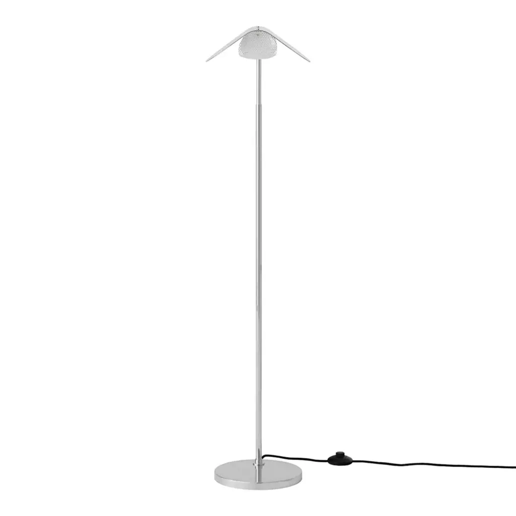 Colombo floor lamp by Joe Colombo for Oluce. This lamp gets its name from the designer who was one of Italy's most iconic designers. The design of this lamp embraces a minimalistic look and was the first household lamp to use halogen bulbs. The diffuser can be adjusted and gives both direct and indirect light. There is a dimmer switch that controls the illumination. It is useful for making as a direct reading lamp or as a background light. The base and reflector are made from lacquered steel and the stem is chromium-plated.Dimensions: 24cm D x 205cm HAvailable as shown:Black: $2160Also available as:Anodic Bronze: $2160
