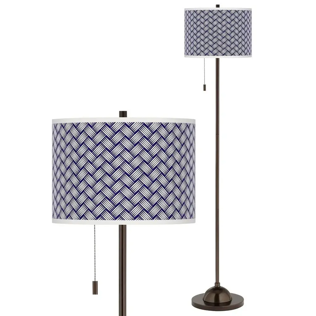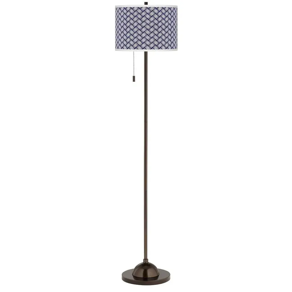 PRODUCT DETAILS: Overall: 62" high. Shade is 13 1/2" wide x 10" high. Base is 11" wide. Takes one maximum 100 watt bulb (not included). On-off pull chain. Club floor lamp with slim profile. Tiger bronze finish. Custom printed Color Weave pattern drum shade. DESCRIPTION: Add style to your favorite room with this club style floor lamp. The lamp comes in a tiger bronze finish and has a slim profile perfect for seating areas, bedrooms and more. Up top is a drum shade with a stylish Color Weave printed giclee pattern. An on-off pull chain hangs below the shade within easy reach. Custom made-to-order shade design.