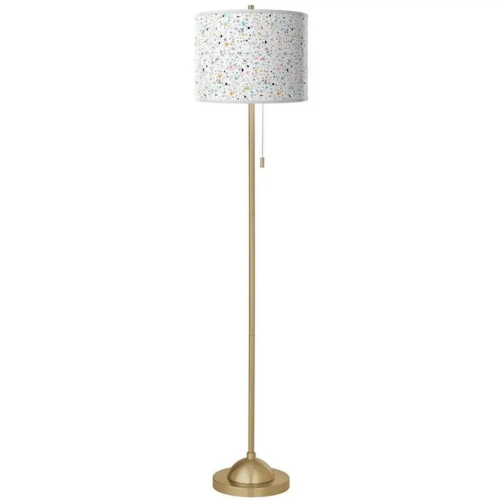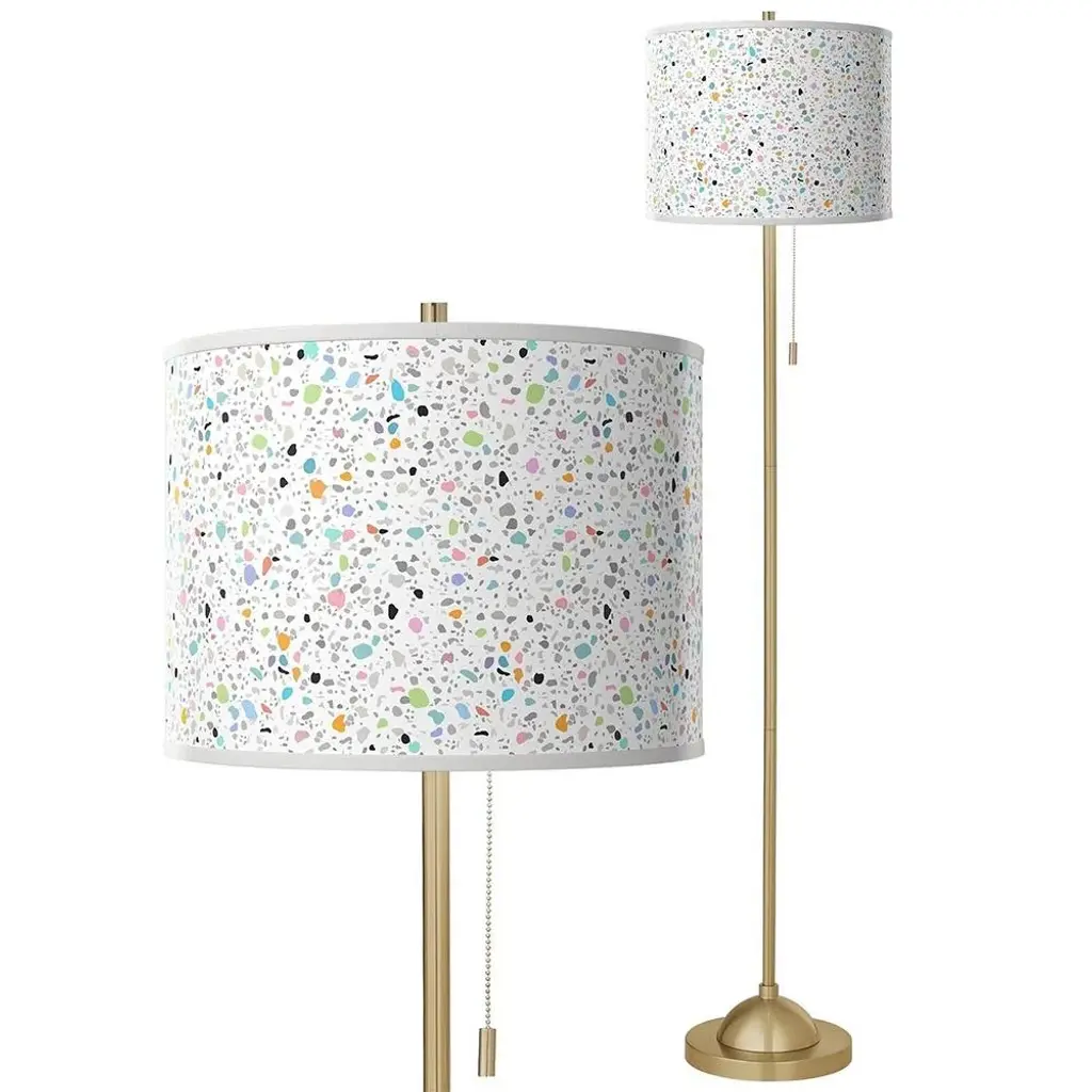 PRODUCT DETAILS: 62" high overall. Drum shade is 13 1/2" wide across the top and bottom x 10" high. Base is 10" wide x 1 1/4" high. Weighs 12 lbs. Uses one maximum 100 watt standard-medium base light bulb (not included). On-off pull chain for easy lighting control. Stick floor lamp from the Giclee Glow brand. Custom printed Colored Terrazzo pattern lamp shade. Note that the shade has a printed pattern on canvas and does not use real terrazzo stone. Shade printing process U.S. Patent # 7,347,593. Warm gold finish. 8-foot long cord. DESCRIPTION: Brighten your home with this modern style stick floor lamp. It features a warm gold finish and is topped by a classic drum shade for a clean look. The shade has an exclusive Colored Terrazzo pattern and is giclee printed and made to order. An on-off pull chain switch allows for easy lighting control.