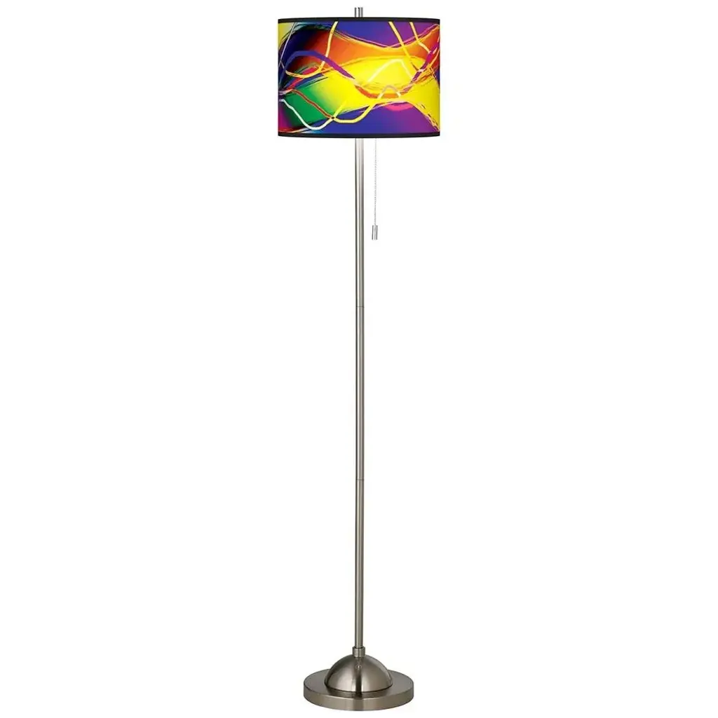 PRODUCT DETAILS: Overall: 62" high. Shade is 13 1/2" wide x 10" high. Base is 10" wide x 1 1/4" high. Takes one maximum 100 watt bulb (not included). Floor lamp with pull chain. Custom printed translucent shade with Colors In Motion pattern. Brushed nickel finish. DESCRIPTION: The base of this floor lamp has a modern look that pairs well with the unique personality of a giclee art shade. The shade is printed by the same technique used in reproducing museum-quality artwork. The base features a cool, brushed nickel finish and has an on/off pull chain.