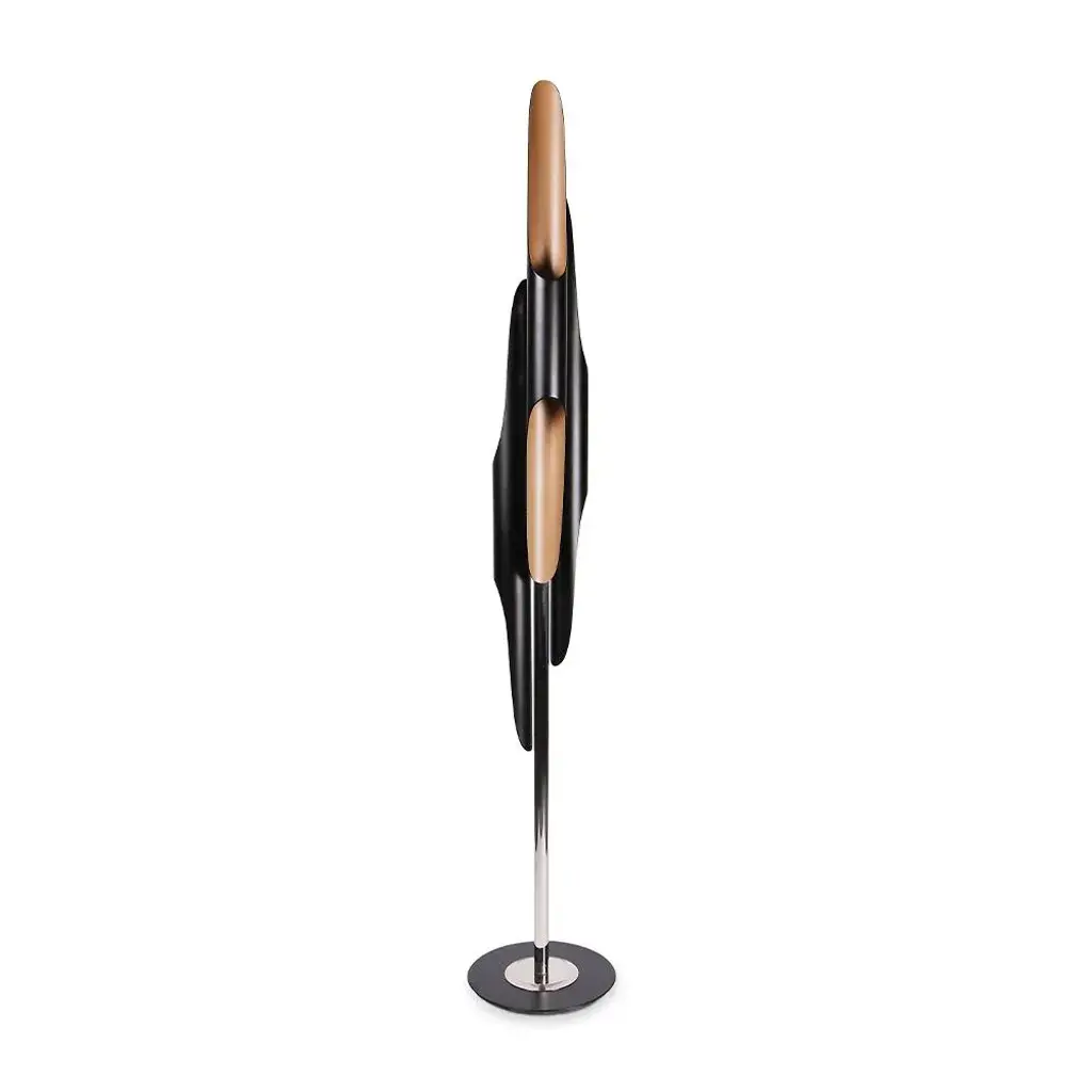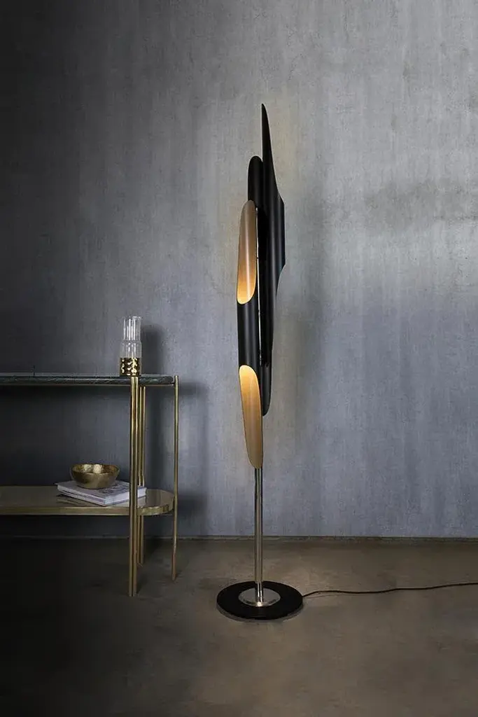 Inspired by the American jazz saxophonist and composer John Coltrane, Coltrane floor lamp embodies the avant-garde jazzy vibe that this legendary musician transmitted in every music concert. Handmade in brass and aluminum, the minimal black floor lamp has a matte black finish on the three lamp shades with a gold powder paint on the inside, that provide a smooth lighting effect. European Plug (up to 250V).