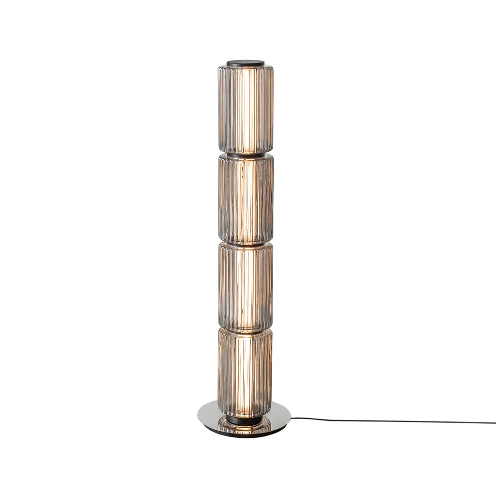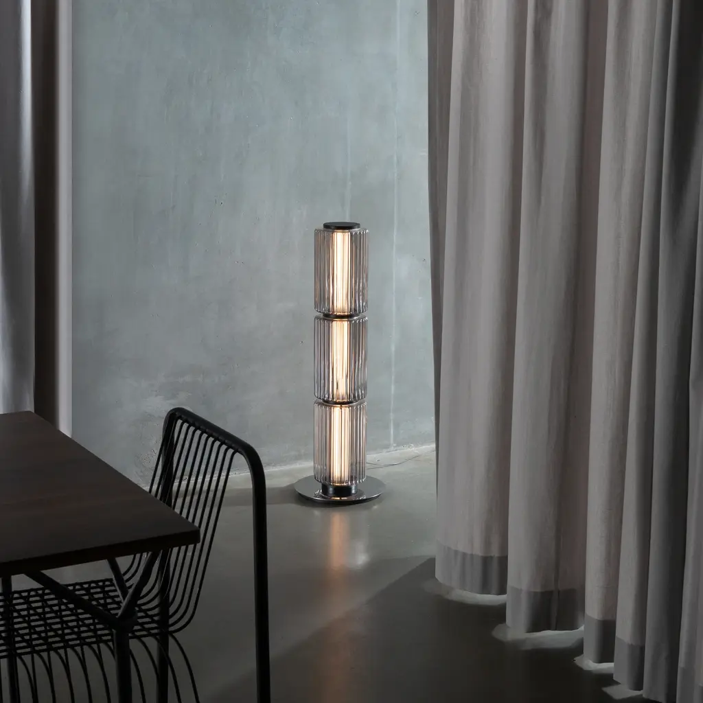 Columns in ancient times expressed both function and beauty—and A-N-D’s floor lamp exhibits a simulate dichotomy, with glass cylinders stacked 3 to 5 high, ascending from a polished stainless-steel base. In the slimmer Column 175, as with A-N-D’s entire series, machine mold-blown glass cylinders come in a choice of a transparent carbon or opaque ivory finish.