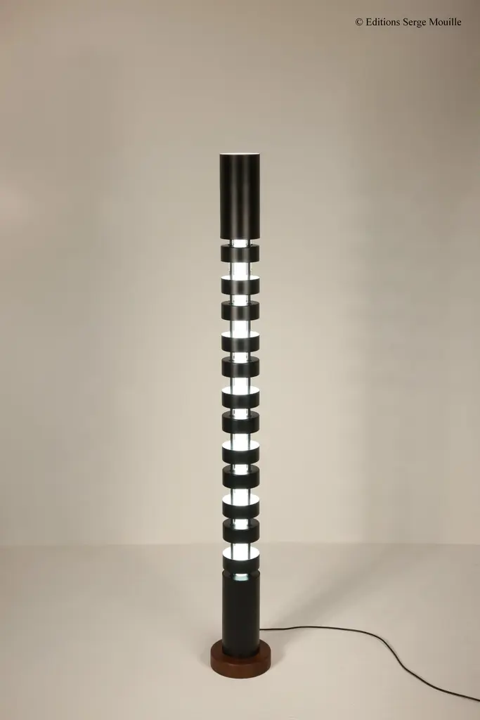 Column lamp large totem by Serge MouilleDimensions: D16 x H173 cmMaterials: Steel, GlassOne of a King. Numbered.Also available in different colour and dimensions.All our lamps can be wired according to each country. If sold to the USA it will be wired for the USA for instance.Reissue of an iconic model from 1962, the Totem Serge Mouille light column is made in France by Éditions Serge Mouille with the same integrity as the original models. Available in two sizes, it consists of a succession of black steel cylinders with a glossy white interior for a pleasant diffusion of light. We assure you a fast delivery for this numbered model with certificate of authenticity. Also available in white.Serge MouilleBorn in Paris in 1922, Serge Mouille is today considered one of the greatest lighting designers in the world. He developed a talent for drawing and creation very early on and was the youngest student of his time to be admitted to the School of Applied Arts at the age of 13.Master goldsmith, Serge Mouille learned the art of modeling metal with a hammer thanks to his mentor Gabriel Lacroix and worked for several goldsmith houses in Paris. It was his meeting with Jacques Adnet, director of the Compagnie des arts français, that would mark a turning point in his career.In 1951, Jacques Adnet commissioned Serge Mouille to create a “large light fixture” for his South American customers: the first three-arm floor lamp was born. This innovative luminaire in molded black steel with organic shapes will influence his famous series of "Black Forms" and will forever mark the history of design. Serge Mouille then passes from the status of master craftsman to that of creative artist.At the beginning of the 1960s, Serge Mouille decided to radically distance himself from everything he had created until then by developing a series of light columns with fluorescent tubes. In 1963, he stopped producing lights to devote himself to teaching.Suffering from tuberculosis, Serge Mouille died in 1988 and his widow, Gin Mouille, decided to continue to bring his art to life by publishing under license his most emblematic creations. Each copy is made in France by Éditions Serge Mouille and has an engraved serial number, accompanied by a certificate of authenticity.