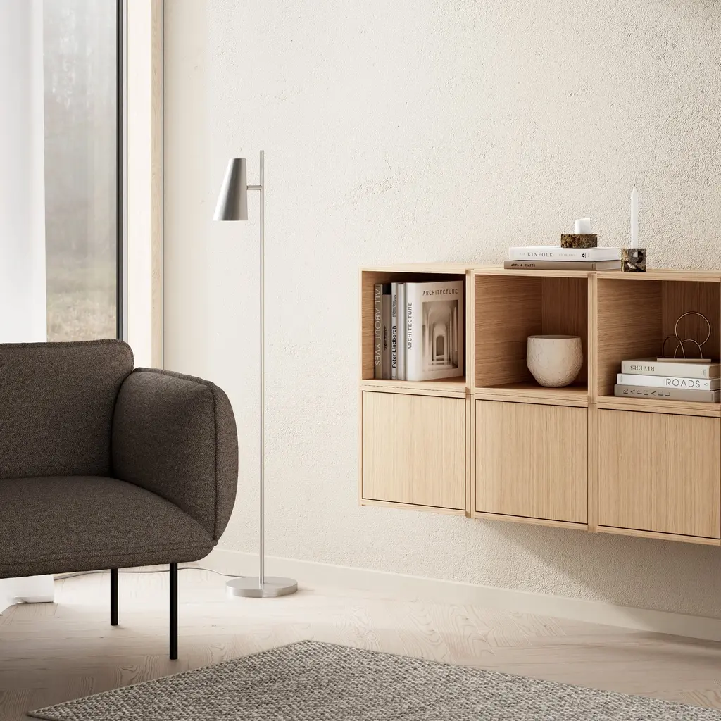 With a classic geometric shade combined with minimalistic, yet soft expression, the Cono Floor Lamp from WOUD does double duty as a contemporary accent lamp and functional reading light thanks to its adjustable shade and directly diffused incandescent lighting -- suitable for a variety of interiors. Highlights