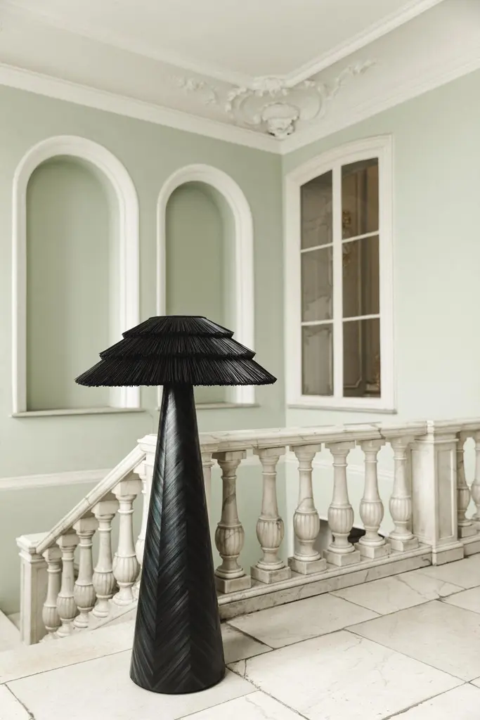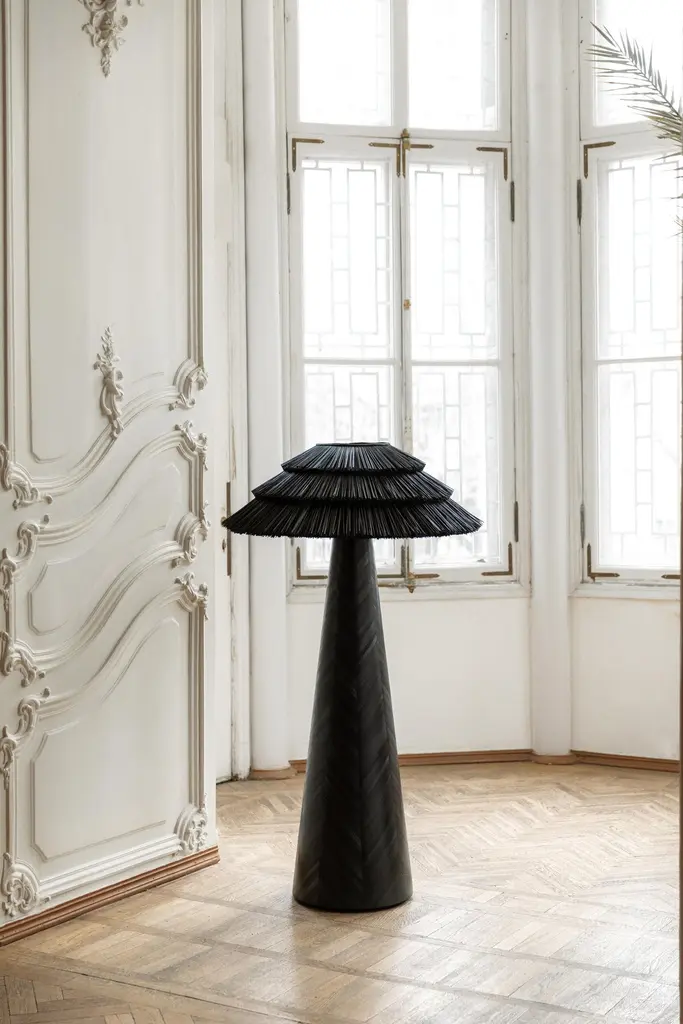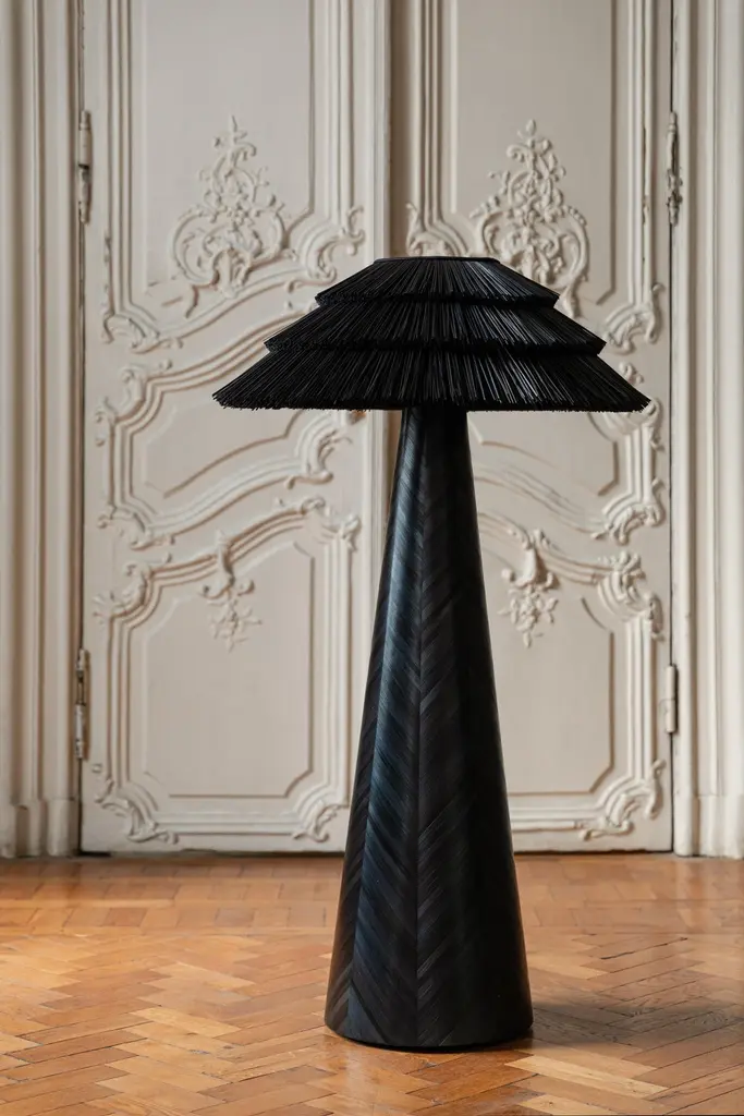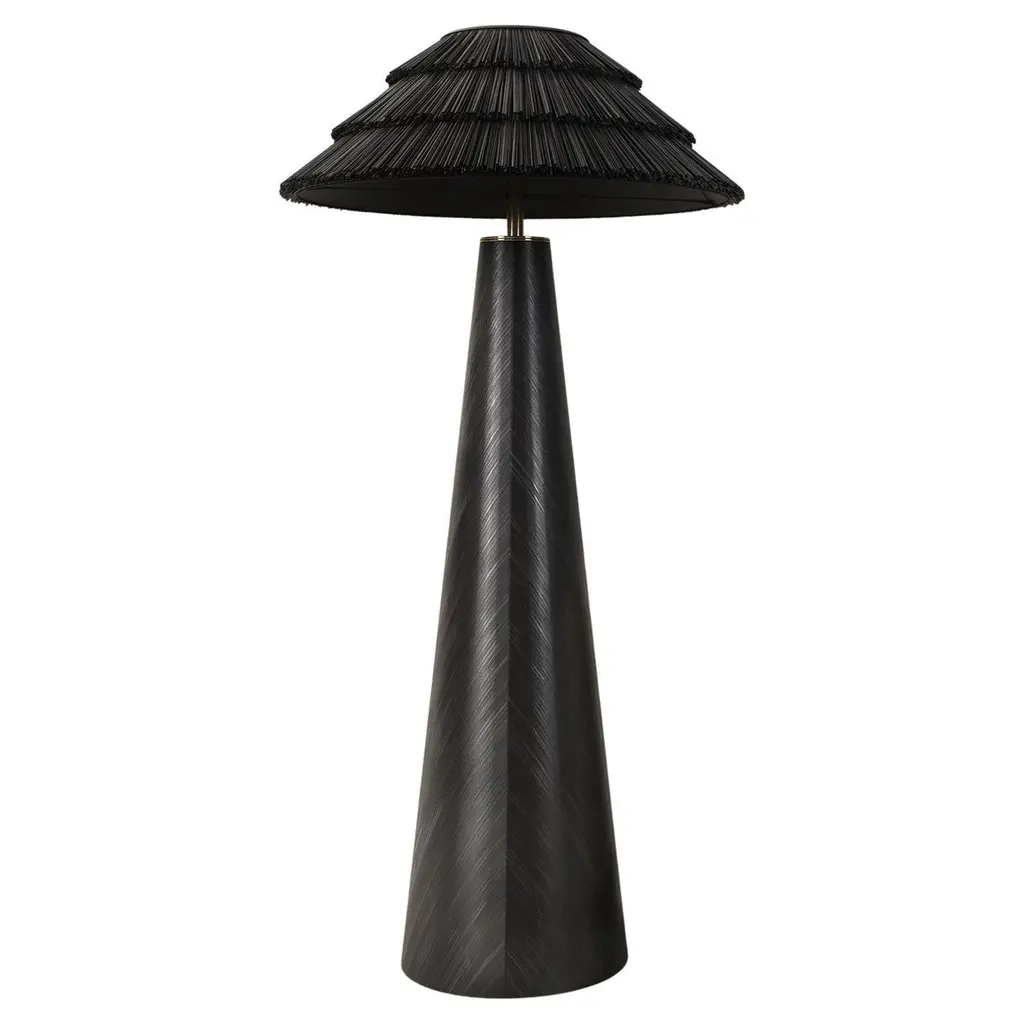 Contemporary Black Floor Lamp In Straw Marquetry Inlay By Ruda