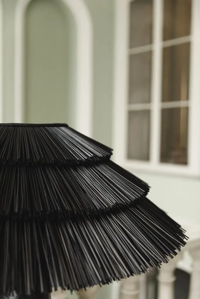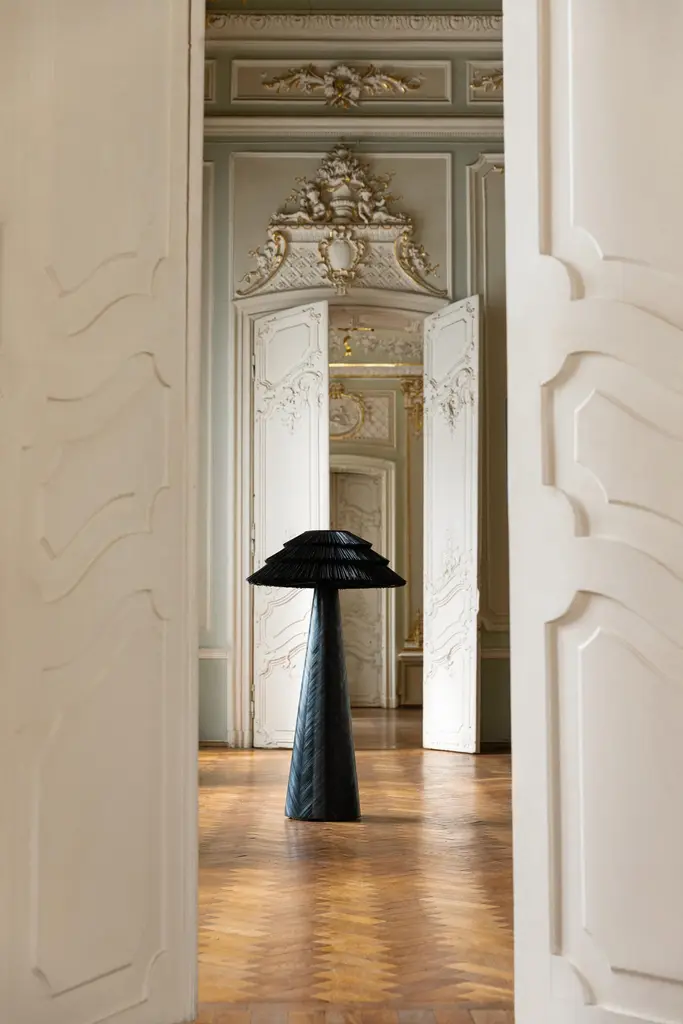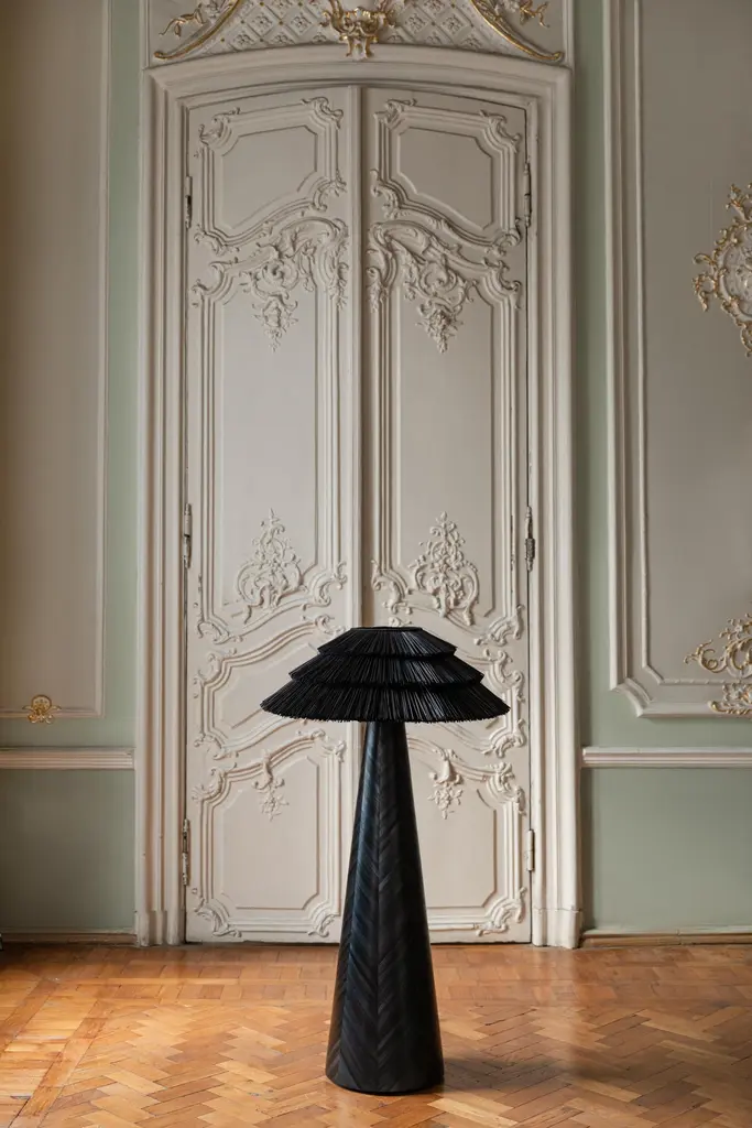 Due to the war, many Ukrainians lost their homes and had to arrange their lives in temporary places of residence. The Roots of Home collection has an associative resemblance to an ancient Ukrainian hut, where the lampshade resembles a roof with a terracing of straw or shingles covered in “tyruvannia” technique.“Tyr” is an oil product, which was extracted in the Carpathian Mountains, with a highcapacity of paraffin. Because of this kind of finishing the wooden roof plates obtain a black colour.Roots of Home collection consists of the small and middle table lamps and a floor lamp.The lamp top is made of a metal frame, homespun canvas and dyed rye straw. The base has the shape of a truncated cone and is inlaid with dyed rye straw in the marquetry technique.The shape of the lamps has a modern look so that the lamps fit into the interiors of the present, but ideologically they are immersed in the ancient origins of our nation.NOW, WHEN UKRAINIANS ARE SCATTERED ALL OVER THE WORLD,THOUGHTS ABOUT HOME WARM THEIR HEARTS MORE THAN EVER.