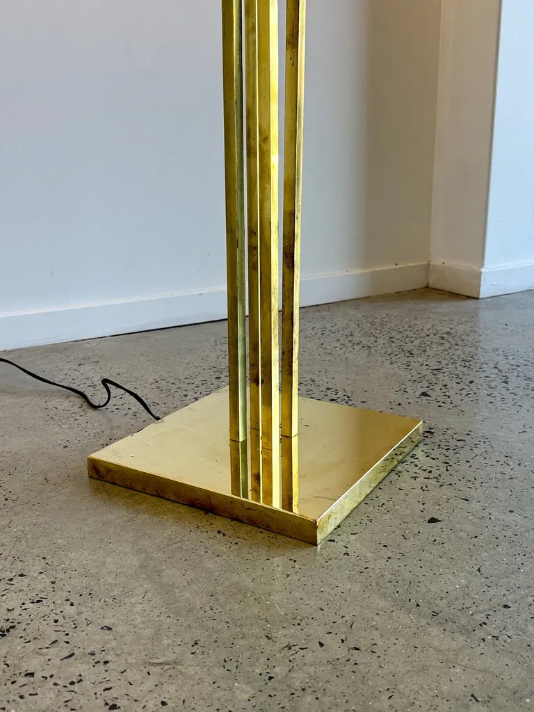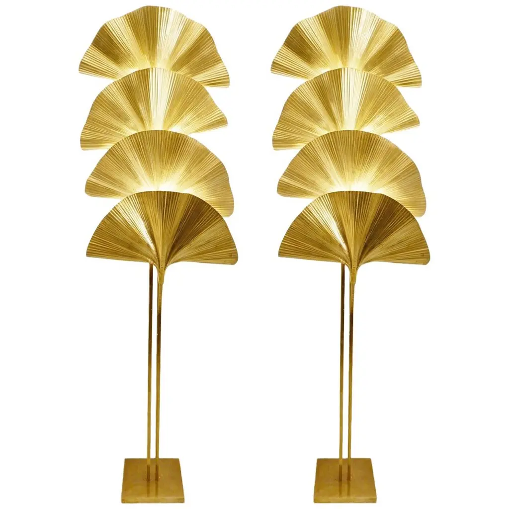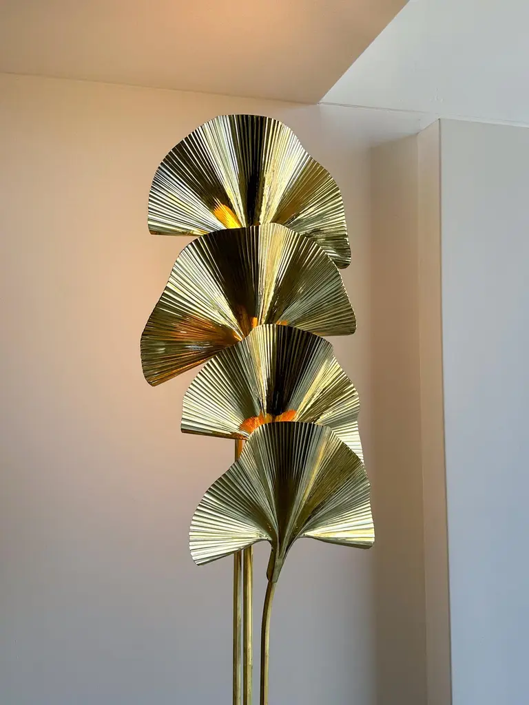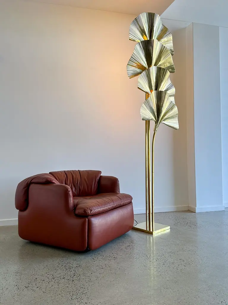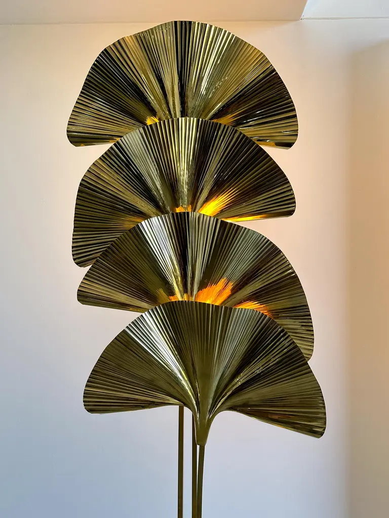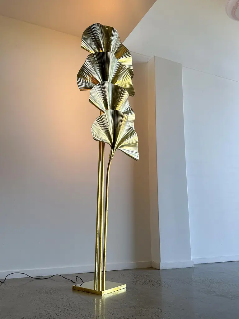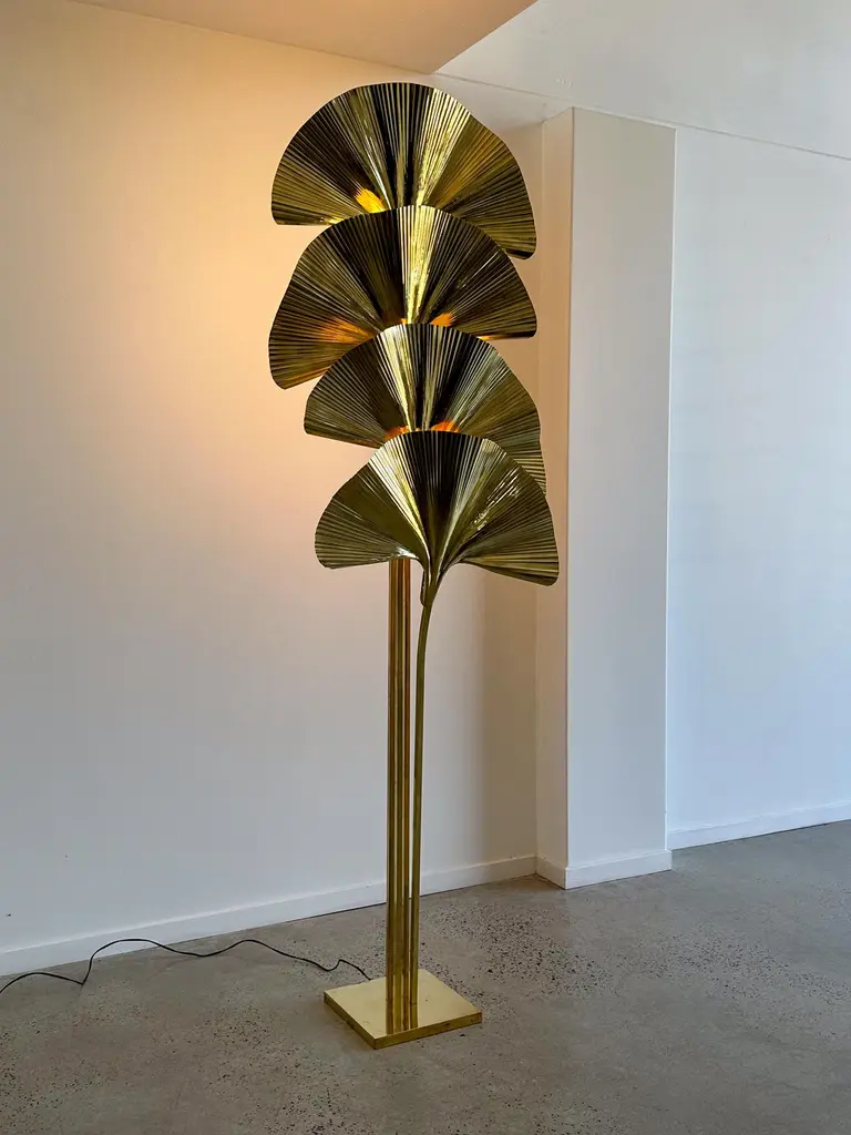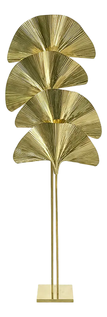 Contemporary large design floor lamp entirely made of brass with four Ginko leaves and square base.This combination of brass and botanical elements creates a stylish design and nature-inspired lighting fixture. The Ginkgo Biloba is a tree known for its distinctive and unique fan-shaped leaves.Place of Origin: ItalyIn style: Mid Century Modern-ContemporaryMaterials & Techniques: BrassCondition: Good condition, wear consistent with the age useDimensions:Heigh: 221cmWidth: 75 cmDepth: 29 cmInternational shipping is available on all items. Please contact us for a shipping quote..