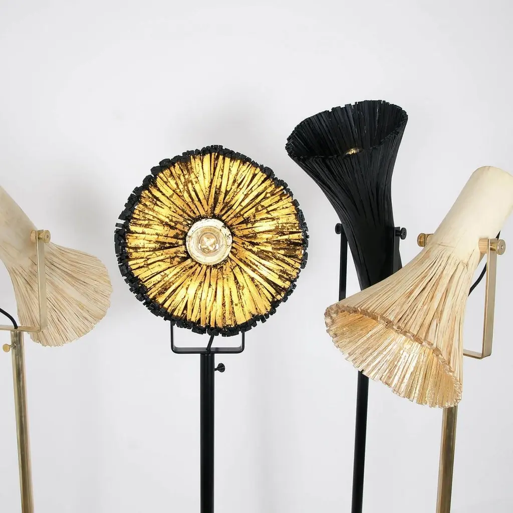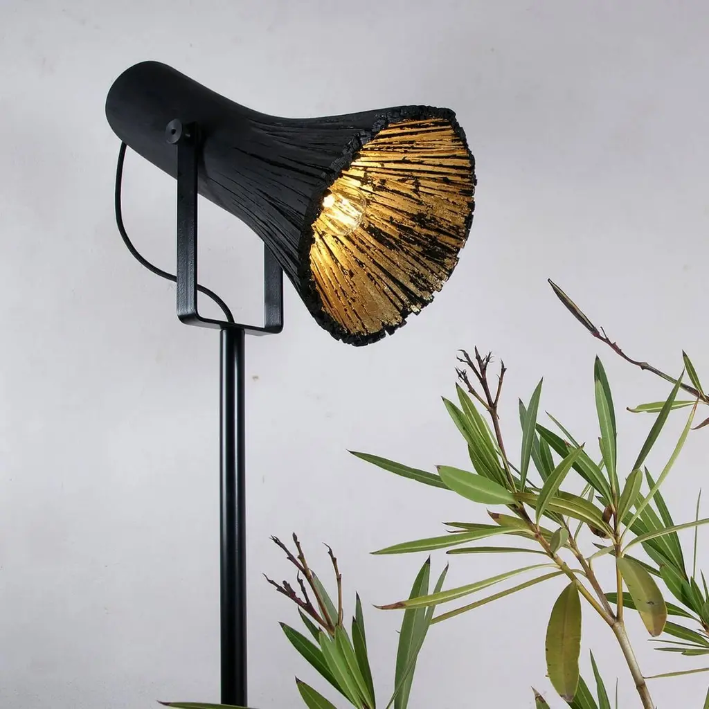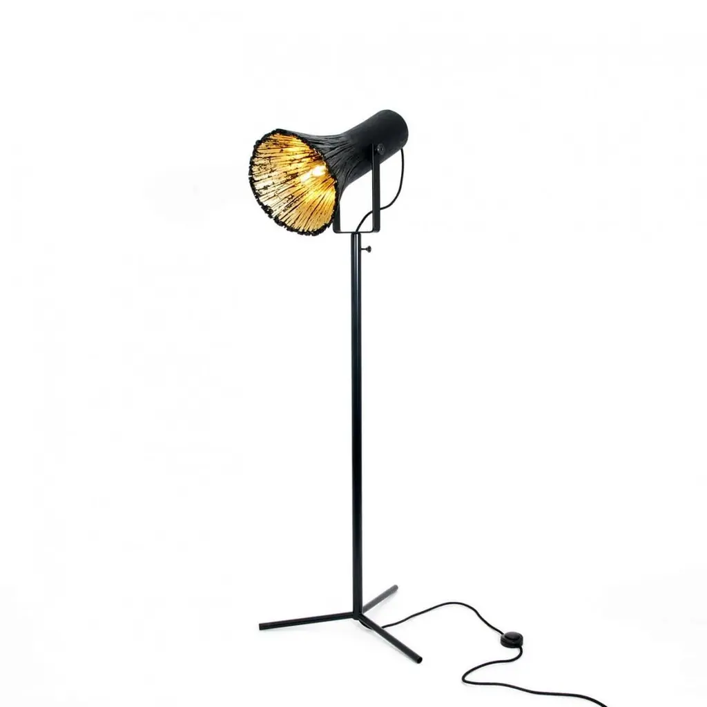 Contemporary wood and brass floor lamp - Pressed wood light natural by Johannes HemannMaterial: wood, brassLight source: bulb E14, max 50 WattDimensions: ø35 x H130 cmThe series „pressed wood black“ is based on the traditional technique of bent wood, but Johannes Hemann combined it with pressure to get a different look. The first step is to put pressure on fresh cut wood and divide it into its fibres. Thereafter the traditional bending technique is being used: steaming the wood and bending it into moulds. Finally the fibrous wood with glue being pressed into the mold. Due to the wood being divided into its fibres, it is possible to achieve much smaller radio or to change the nature round base to a rectangular profile, for example, or any other shape that might follow.For this series Johannes Hemann is using U shaped bases which are combined to make a stool by combining 2 U shaped branches with a leather/wood combination. The light is totally shaped from fibrous wood. The parts are stained in black.Made by hand, in Germany.This item is made to order. All our lamps can be wired according to each country. If sold to the USA it will be wired for the USA for instance.Crate included in the price.