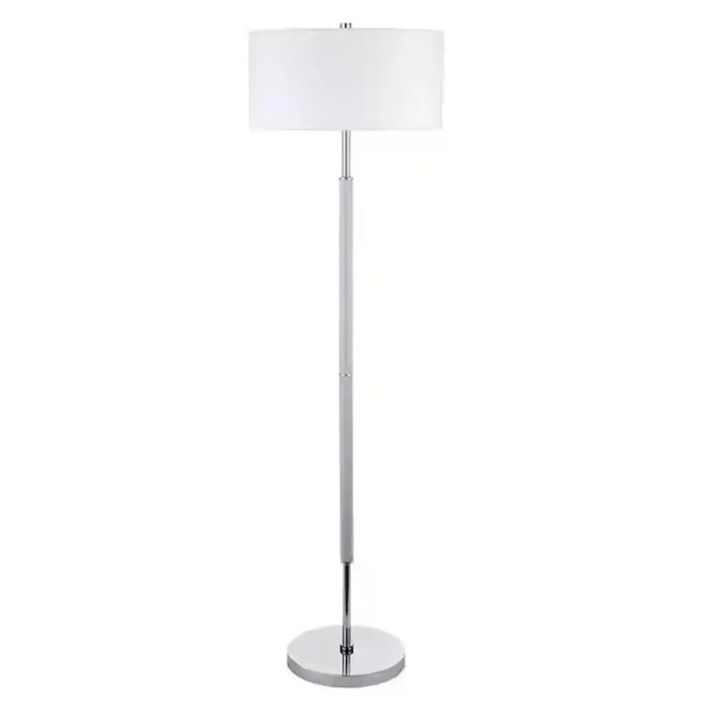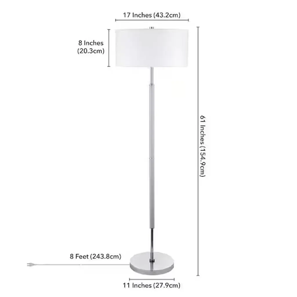 Add visual interest to any room with this 2-toned contemporary floor lamp. On-trend neutral colors are perfectly paired with lustrous metallic accents to elevate your design scheme. Its generous French drum shade holds space for 2-bulbs to cast extra light wherever its needed. Highlights Handcrafted finish in 2 complementary tones Paired with a French drum shade Shade is in a crisp chiffon color and is made of 100% linen with polystyrene lining for durability Rated for two 100-Watt incandescent bulbs, 9-Watt LED bulbs, 23-Watt fluorescent (CFL) bulbs or 9-Watt self-ballasted LED bulbs, E26-base bulbs Includes an 8 ft. cord Dual rotary socket switches Clean with a soft, dry cloth, no harsh chemicals or abrasive cleaning materials