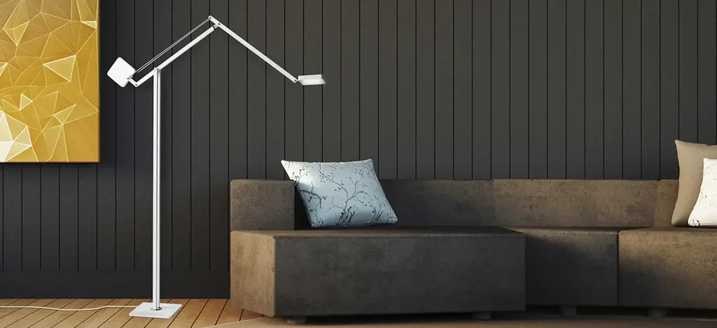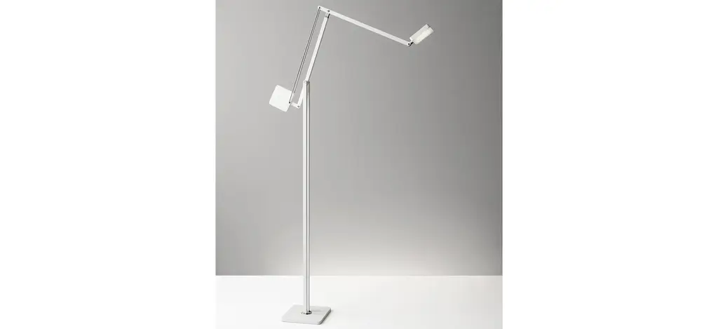 The perfect fluid arm movement has been discovered in the Cooper LED Floor Lamp. Two square shapes of the same size cooperate to create a fluid movement. One is dense and heavy to act as a counterweight, the other one is light and hollow to act as a lamp shade. The counter-balanced lamp construction will not get loose over time since it is based on the force of gravity, and not from friction or a steel spring. 600 lumens of warm, bright light is dimmable by a touch switch on the metal pole. This functional 8 watt LED light adjusts from 45 to 69 inches in height and extends from 19 to 39 inches in depth providing a full range of reach that is also rotatable by the base. Keeping it simple with a solid matte white finish, the minimalistic design focuses on the lamps unique shape. The style is finished off with a decorative fabric covered cord.