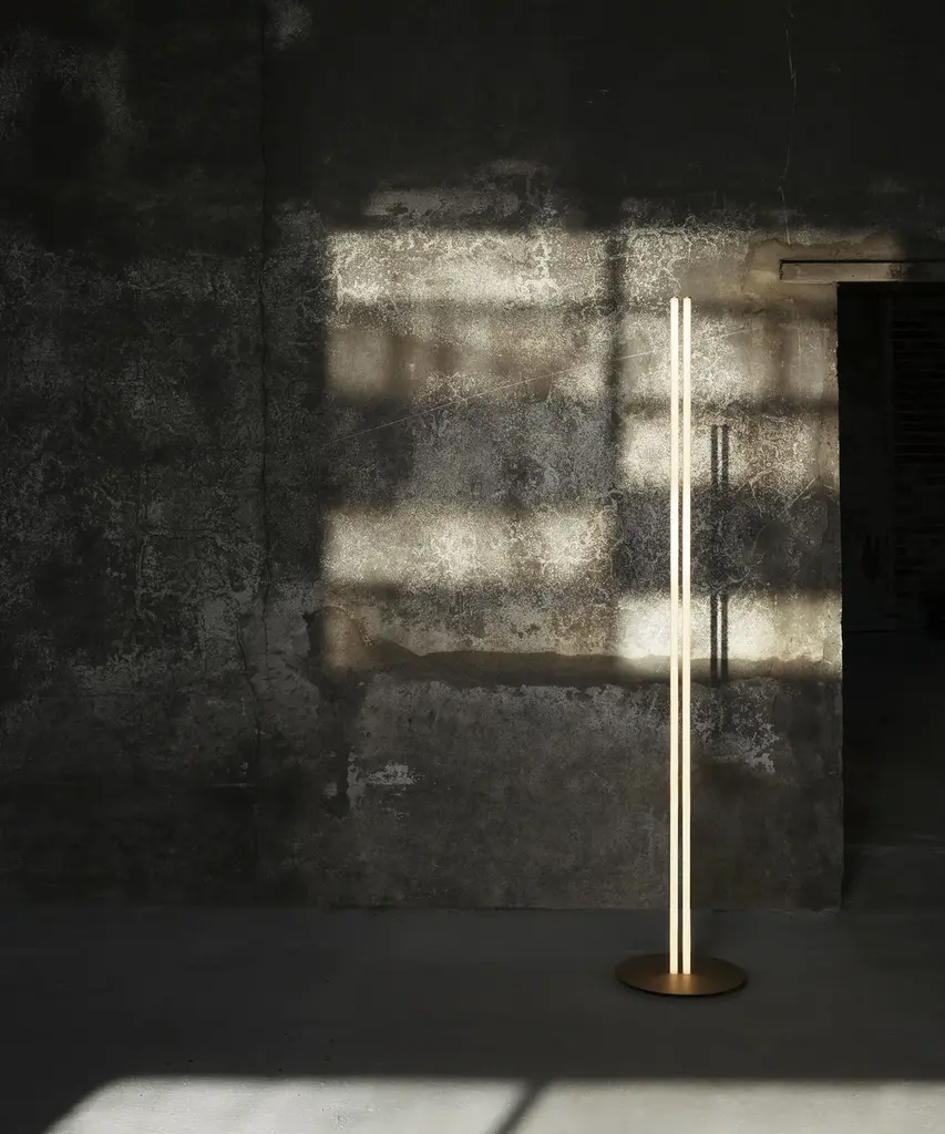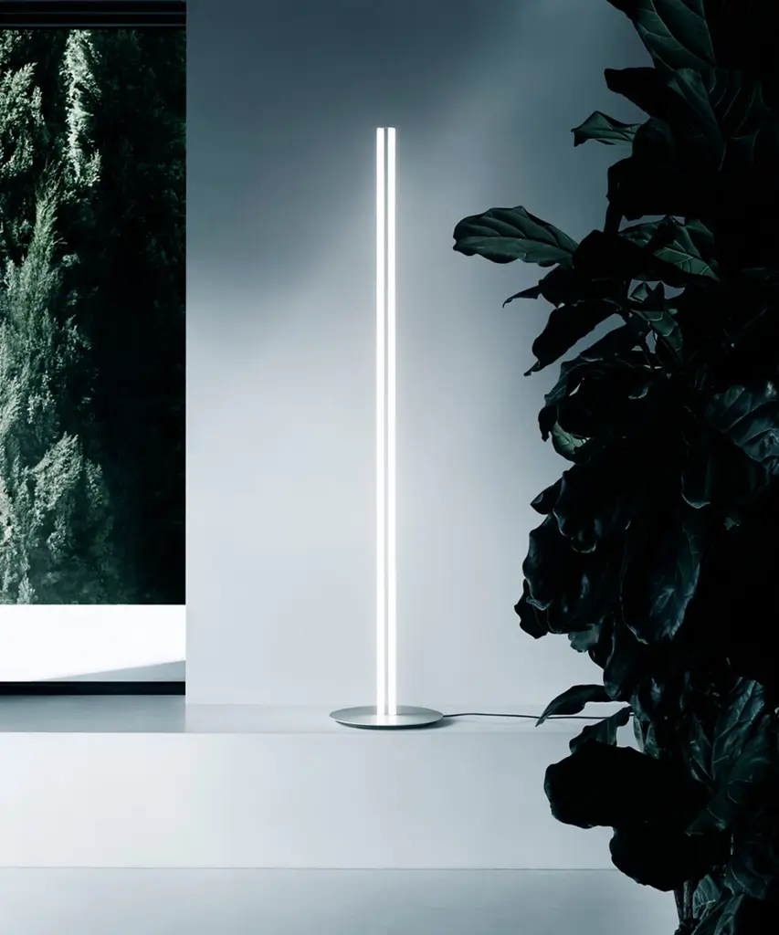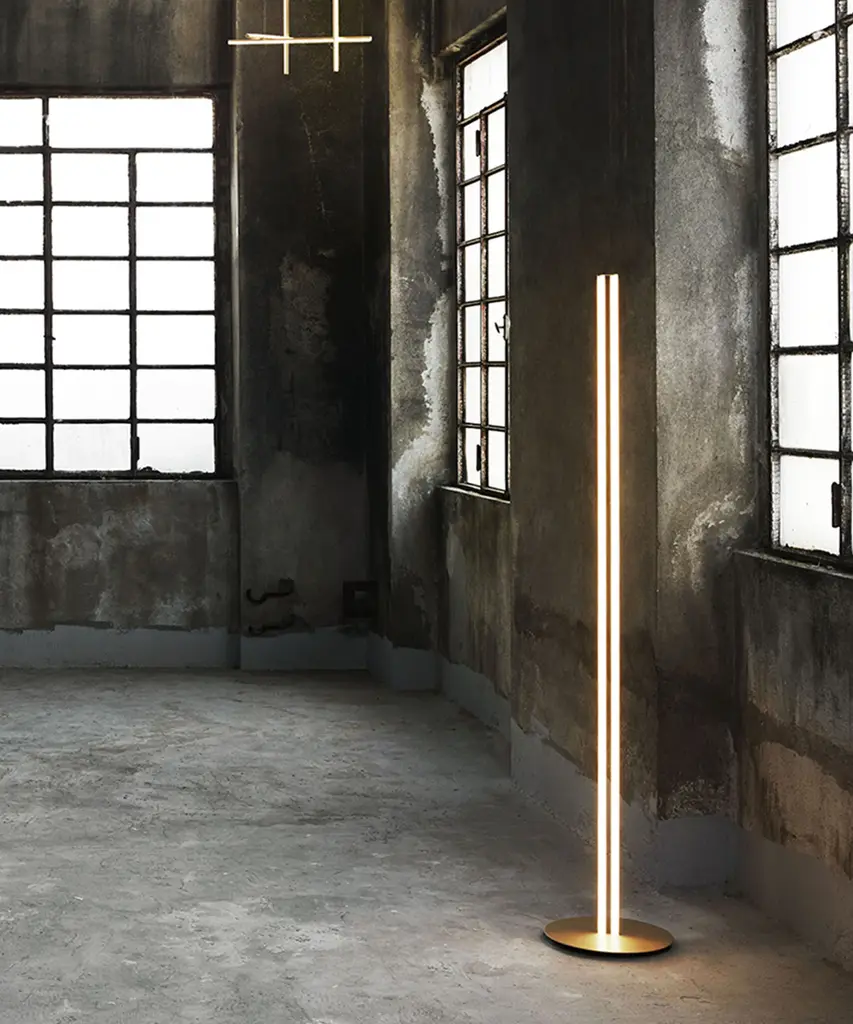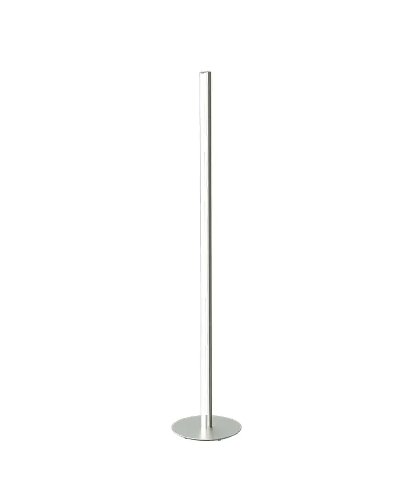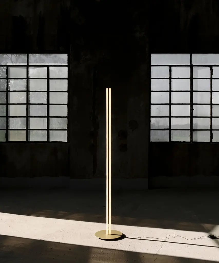 Coordinates' collections consist of horizontal and vertical LED strip lights that form illuminated grid-like structures of various complexities. A vertical floor lamp model featuring a simple round base and two lighting bars, which can be set at the preferred beam angle during assembly. Available in two finishes: Champagne, a luxurious shade of pale tan-with hints of beige, and gold tones and Argent, a shiny grayish metallic silver. Height: 6.5 feet Behind the Design: This design evolved from a commission for the feature lighting of the main dining area of the historic Four Seasons restaurant in New York City. The restaurant relocated and opened in 2018 with the interiors designed by São Paolo-based architect Isay Weinfeld. This authentic design is produced in Italy exclusively by Flos.