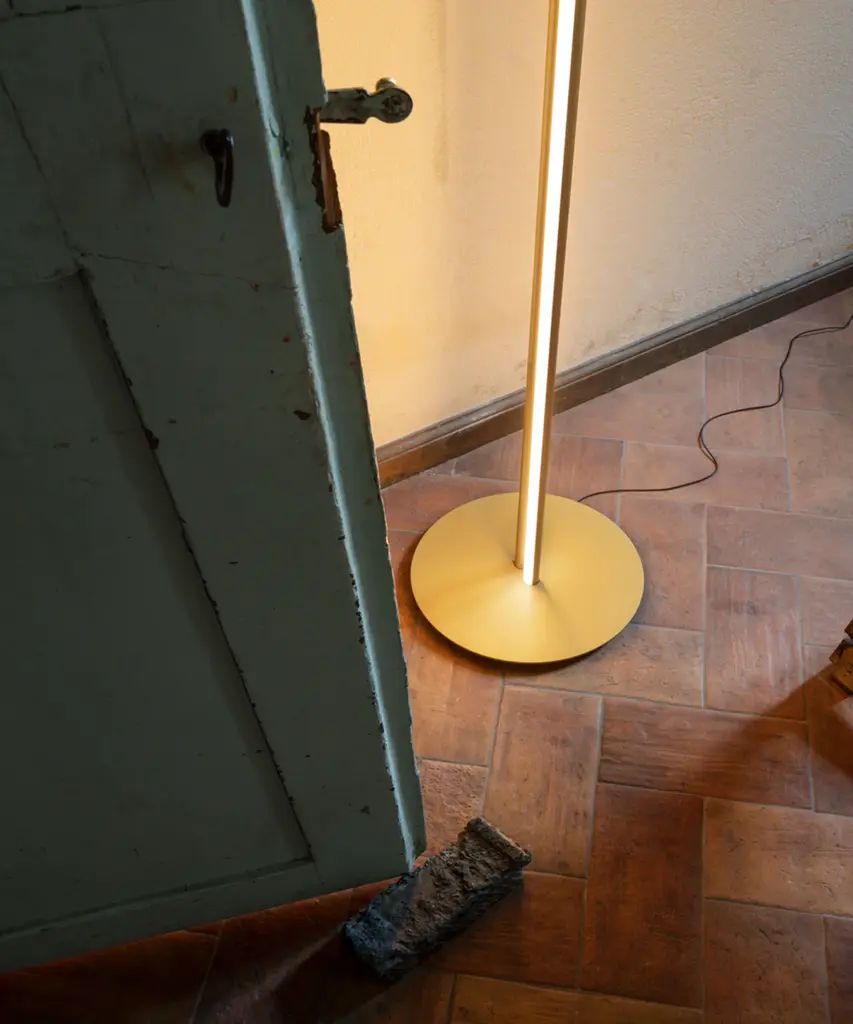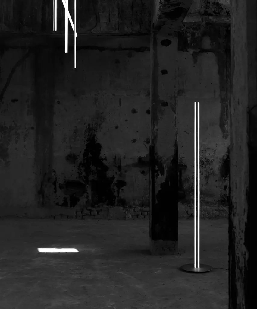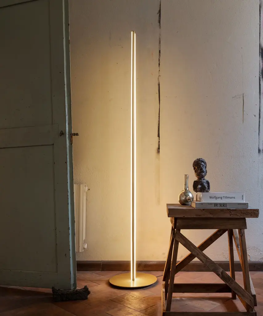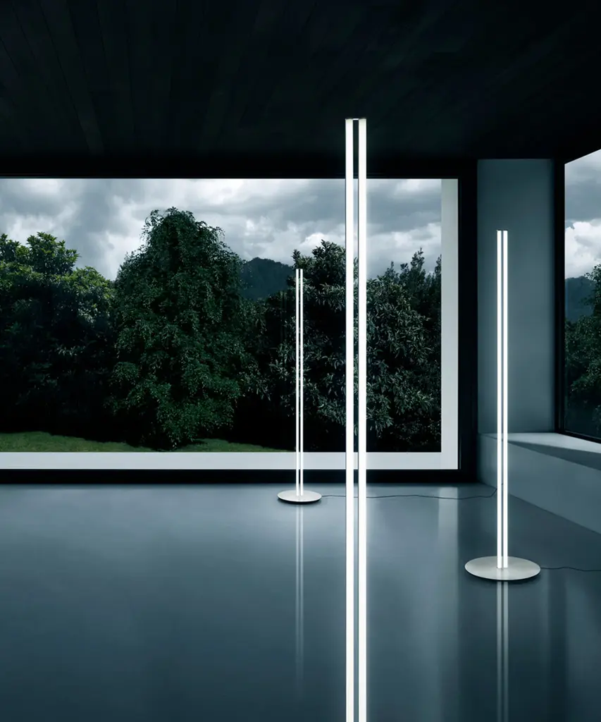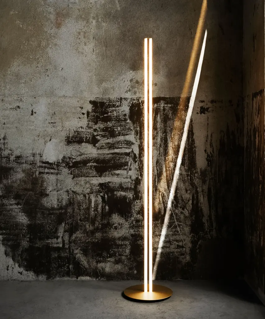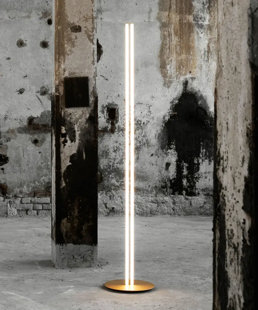Coordinates' collections consist of horizontal and vertical LED strip lights that form illuminated grid-like structures of various complexities. A vertical floor lamp model featuring a simple round base and two lighting bars, which can be set at the preferred beam angle during assembly. Available in two finishes: Champagne, a luxurious shade of pale tan-with hints of beige, and gold tones and Argent, a shiny grayish metallic silver. Height: 6.5 feet Behind the Design: This design evolved from a commission for the feature lighting of the main dining area of the historic Four Seasons restaurant in New York City. The restaurant relocated and opened in 2018 with the interiors designed by São Paolo-based architect Isay Weinfeld. This authentic design is produced in Italy exclusively by Flos.