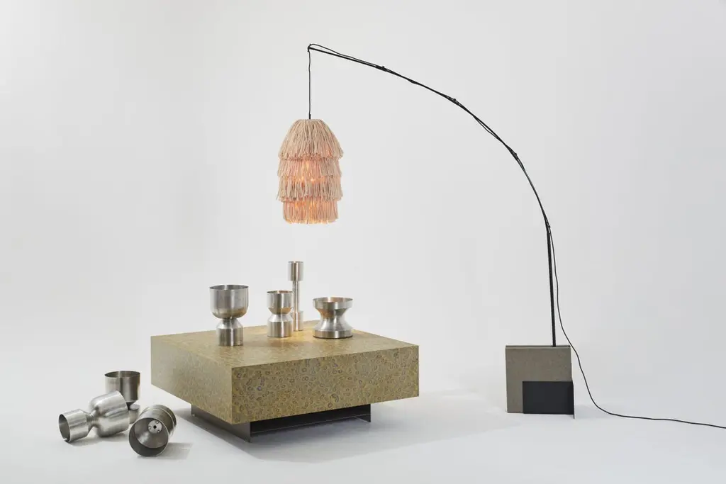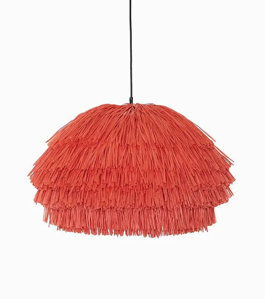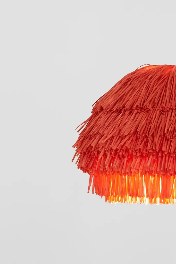 Coral Fran CS stand floor lamp by Llot LlovHandcrafted light objectDimensions: D 65 x W 205.8 x H 250 cmMaterials: raffia fringes, glass fiber, steel, concreteColour: coralAlso available in green, beige, black.Another member of the FRAN family is the floor lamp FRAN STAND. The pole that supports the FRANs lamp body is made of glass fiber and is plugged together according to the tent pole principle. It is thus flexible so that the lamp begins to swing in the wind or when touched. The base that holds the lamp is made of powder-coated steel. For the necessary weight, but also for the individual style, the base consists of two compartments into which classic concrete floor plates are embedded for weighting. But any other stone slab in a suitable format can also be used for weighting and design.With their bulky silhouette and rustling fringes, the FRAN lights are reminiscent of a piñata. While their cable becomes the suspension string, their fluttering body is made of high-quality rayon, a viscose fibre based on cellulose. The fringe strands are fitted in layers and create a subtle bob or a bulky statement piece – depending on the amount of material. FRAN is available in four bold block colours (beige, red, green and black), which work on their own as in monochrome or contrasting combinations as well. Despite their volumes, the shades can be folded flat for shipment.Behind the LLOT LLOV brand is the studio for product and interior design as well as the producer of furniture, objects, lighting and surfaces. Since their foundation in 2006 by Ania Bauer and Jacob Brinck, the two Berlin based author designers have established themselves internationally. One of their recognizable features is the reinterpretation of traditional arts and crafts brought into a contemporary design context.An example of this is OSIS, an innovative surface finish using salt crystals and colour pigments on wood, with which they won the German Materials Prize, among other awards. They use OSIS as well as the terrazzo GLACIER, which was introduced in 2018 and is made of nail polish bottles, for their own designs, but they also supply interior designers worldwide. For GLACIER, as for other designs, they upcycle high-quality materials, for example from the cosmetics industry. Their objects are manufactured in Europe, often in social workshops, and distributed directly by LLOT LLOV.LLOT LLOV produce exclusive furniture and objects for private or corporate clients and also manage interior design projects such as hotels or offices. In addition, the duo has been running a shop for fashion and accessories in Berlin-Mitte with BAERCK since 2007.
