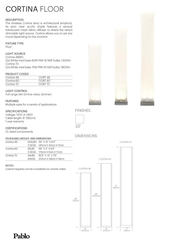The timeless Cortina lamp is architectural simplicity. Its stoic clear acrylic shade features a sensual translucent mesh fabric diffuser to shield the lamp’s dimmable light source. Cortina allows you to set any mood depending on the moment.Features:Multiple sizes for a variety of applicationsSpecifications:Voltage: 120V or 240VCable length: 6’ (182cm)Light Source: (2x) White med base 60W PAR 16 NSP bulbs: 1300lmLight Control: Full range DIM (in-line rotary dimmer)1 year warrantyMaterials:Cast Iron base, Polycarbonate shade, Polyester diffuser.