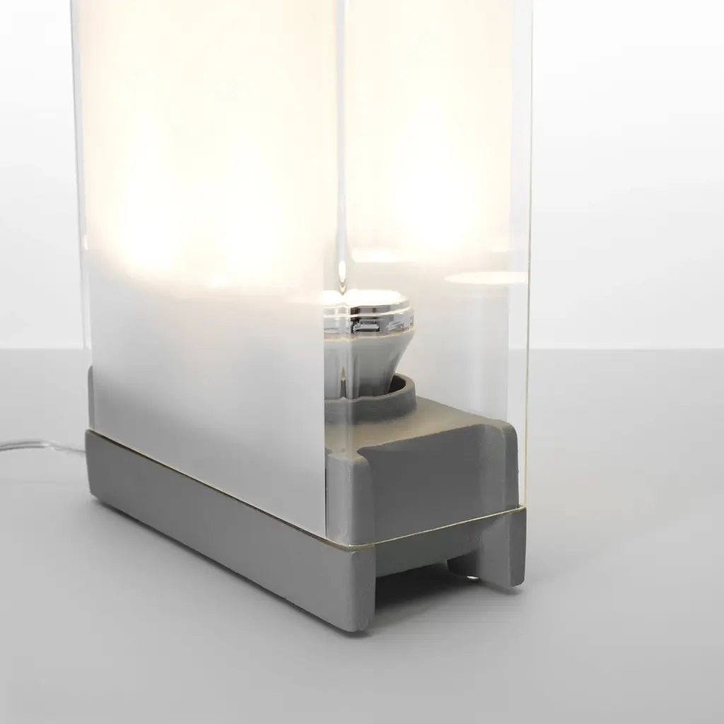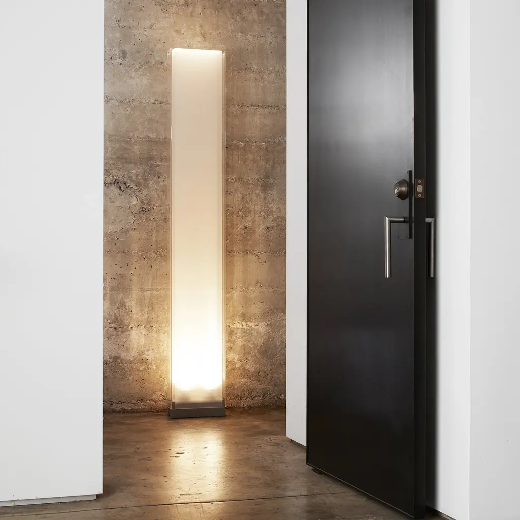 A simple cast-iron base supporting a column-like clear acrylic shade makes the this floor lamp, like the rest of its siblings in the Cortina collection, an exercise in minimalism. There's certainly a strength of purpose in Pablo Pardo' resolutely architectural form. Overlaid with a mesh diffuser, the fully dimmable light source suits nearly any mood or setting. Duly impressive when placed singly or in groupings of the available varied heights.
