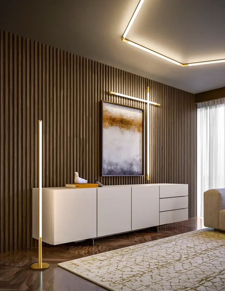 COSIMA is a floor lamp made for methacrylate, brass and aluminium.A blade of light that draws spaces with its minimal lines, a luminous tube in opal plexiglass (available in different lengths) with the metal frame in brass or in painted metal. Cosima is an extremely flexible lamp that stimulates the designer’s creativity. It can be used individually but also allows you to create custom compositions on the walls or to imagine spectacular suspended solutions even in large environments.Light Source:-LED 23W - 2700/3000/4000K - 956 Lm-LED 30W - 2700/3000/4000K - 1092 LmDimming:PUSH